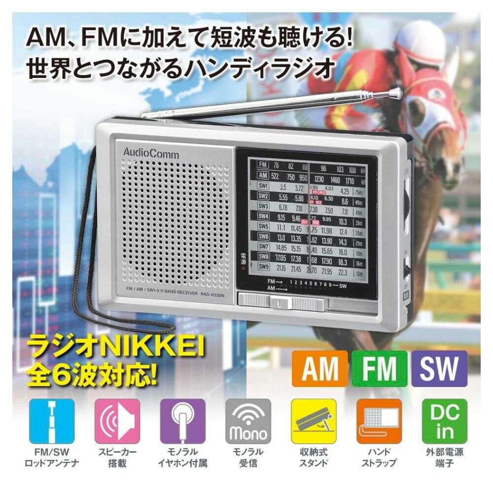 ラジオNIKKEI全6波対応、AM、FMに加えて短波も聴ける、世界とつながるハンディラジオ、FM/SWロッドアンテナ搭載、スピーカー搭載、ワイドFM対応、モノラル受信、モノラルイヤホン付属、収納式スタンド付き、ハンドストラップ付き、外部電源端子付き、乾電池、AC電源、2WAY対応、乾電池・ACアダプター別売