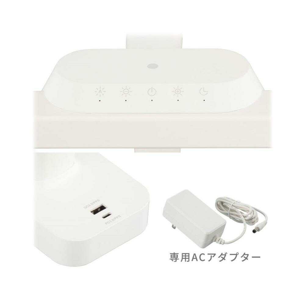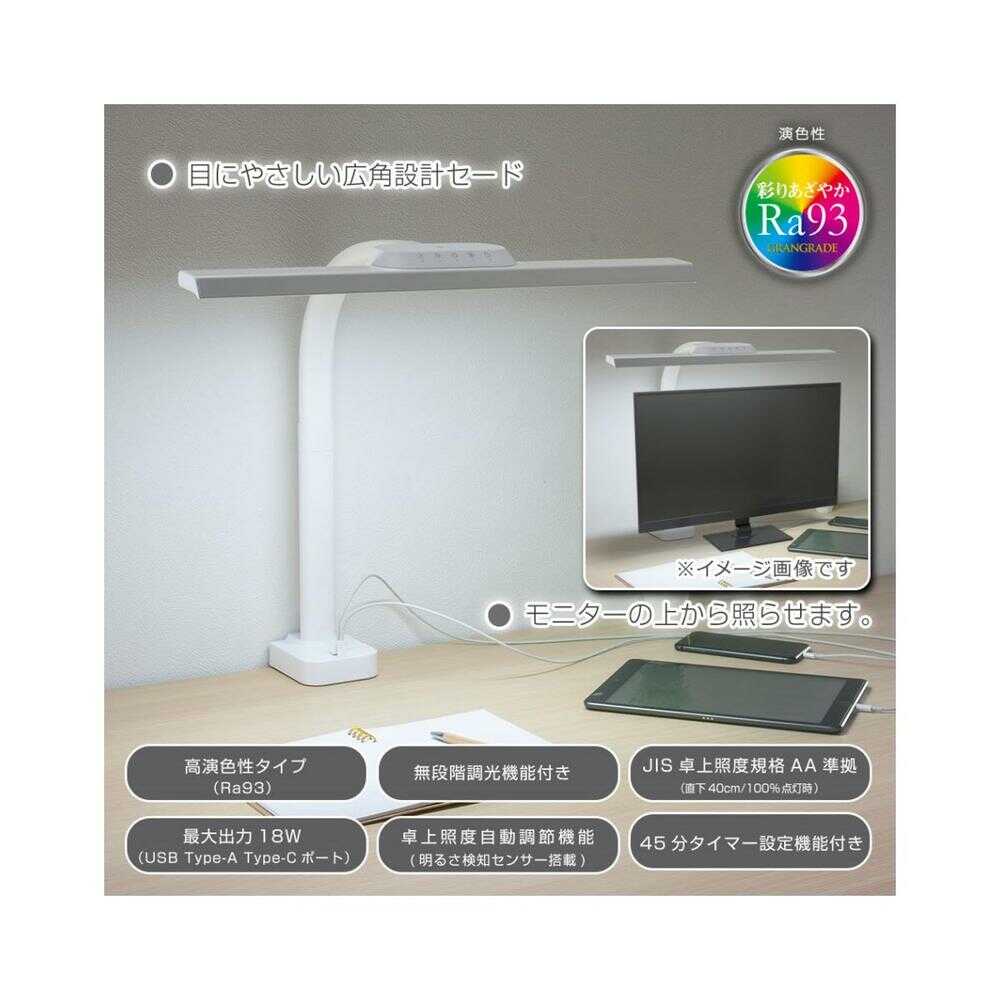 ●彩りあざやか、Ra93の高演色性タイプ ●卓上照度自動調節機能(明るさ検知センサー搭載) ●最大出力18W(USBType-AType-Cポート) ●JIS卓上照度規格AA準拠(直下40cm/100%点灯時) ●無段階調光機能付き ●45分タイマー設定機能付き ●目にやさしい広角設計セード ●モニターの上から照らせます