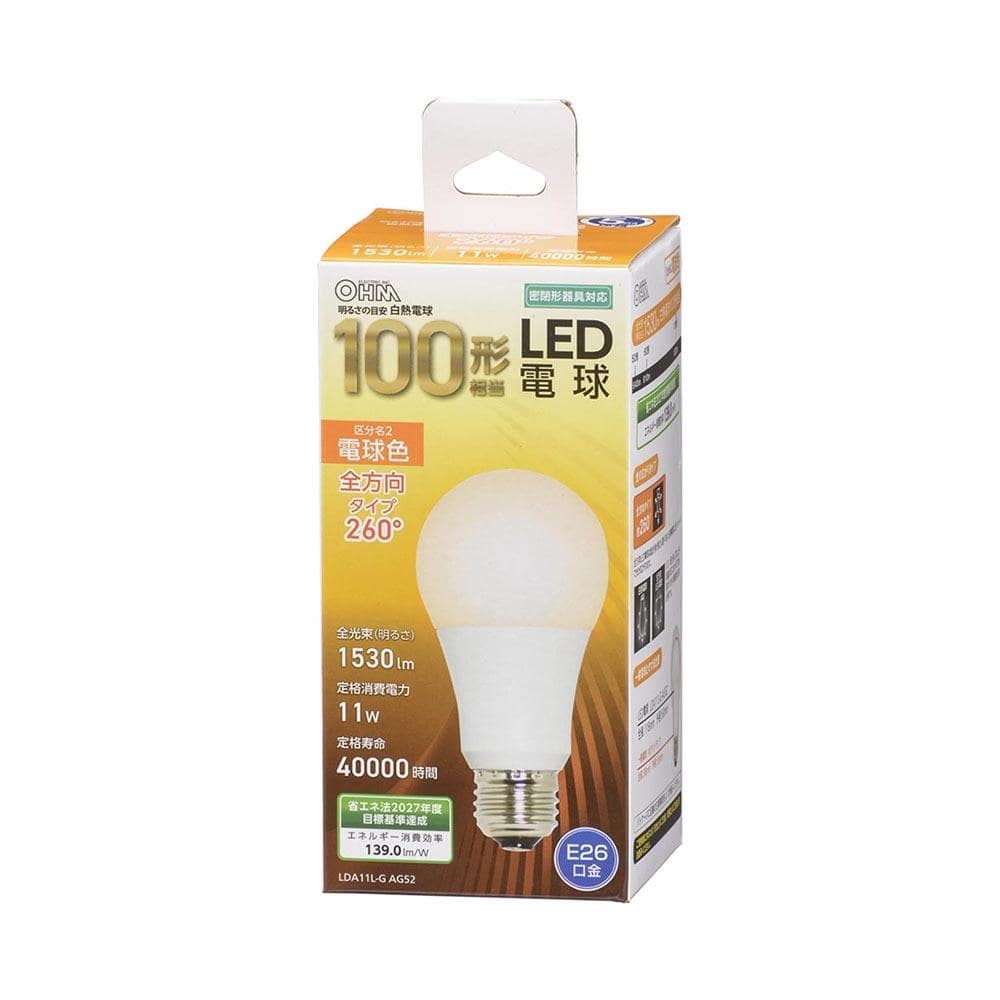 定格寿命40000時間、全光束1530ルーメン、白熱電球100形相当、光の広がり約260°、全方向タイプ、密閉形器具対応、省エネ、電球色、E26口金