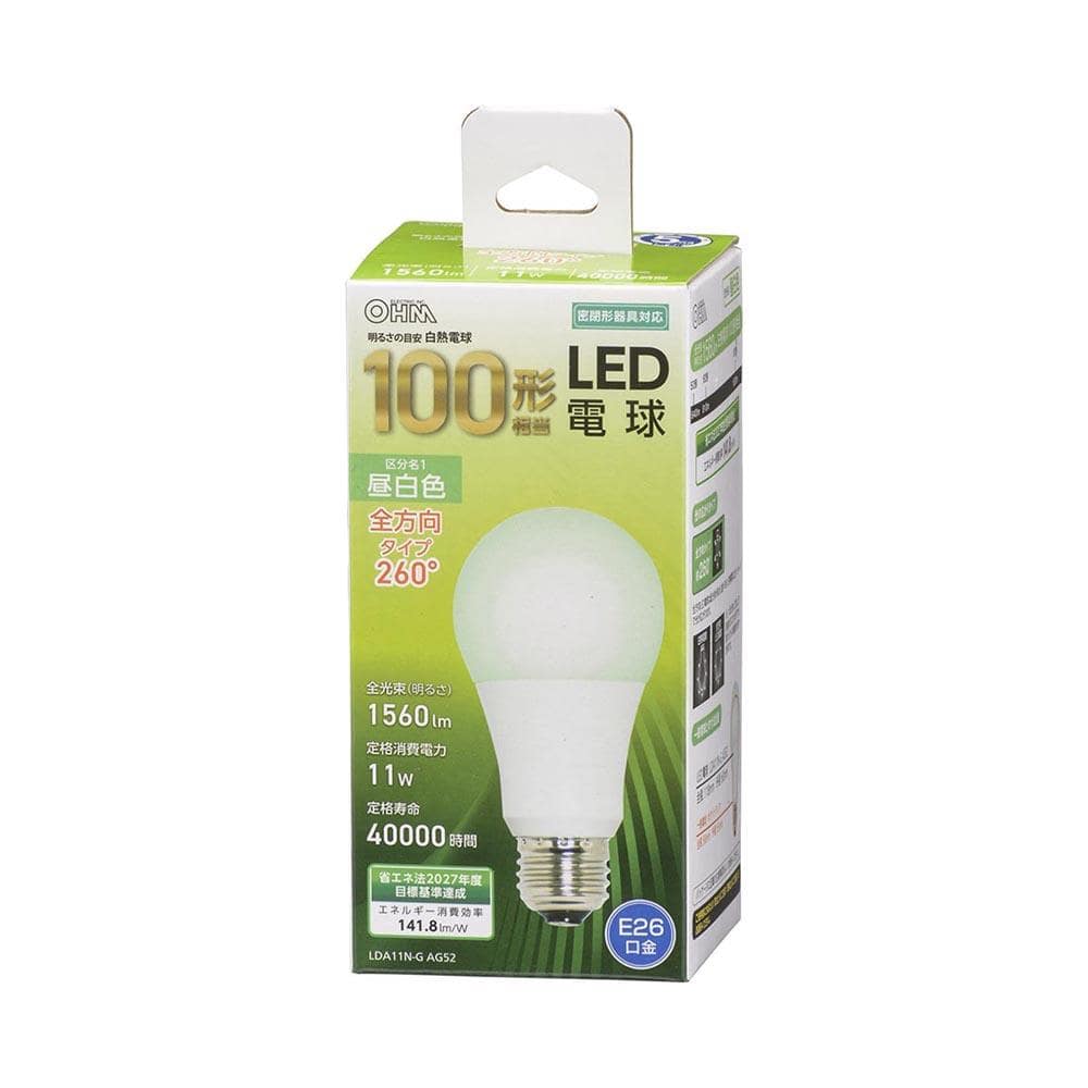 定格寿命40000時間、全光束1560ルーメン、白熱電球100形相当、光の広がり約260°、全方向タイプ、密閉形器具対応、省エネ、昼白色、E26口金
