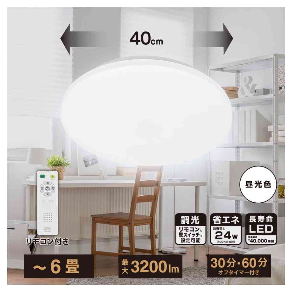 直径40cm、シーリングライト、明るさ4段階調光、明るさ最大3200ルーメン、適用畳数、6畳、30分、60分、オフタイマー付き、光源色、昼光色、リモコン付き、LED5年保証対象商品