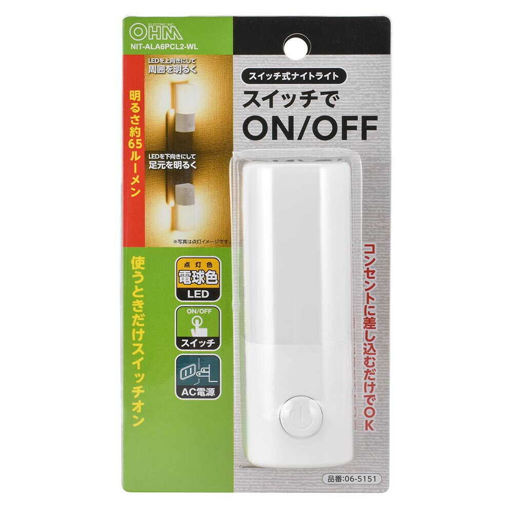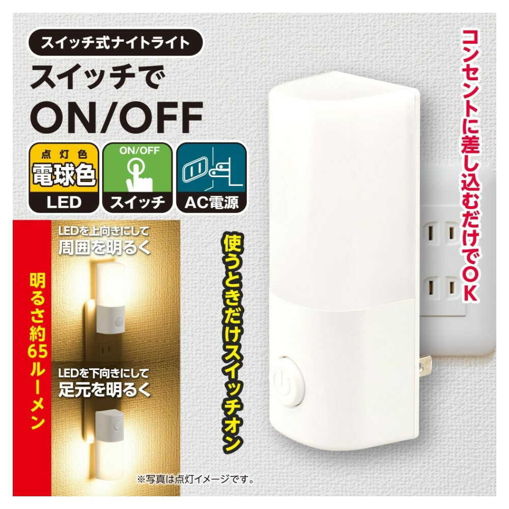 スイッチ、ON、OFF、LEDを上向きにして周囲を明るく、LEDを下向きにして足元を明るく、明るさ約65ルーメン、コンセントに差し込むだけ
