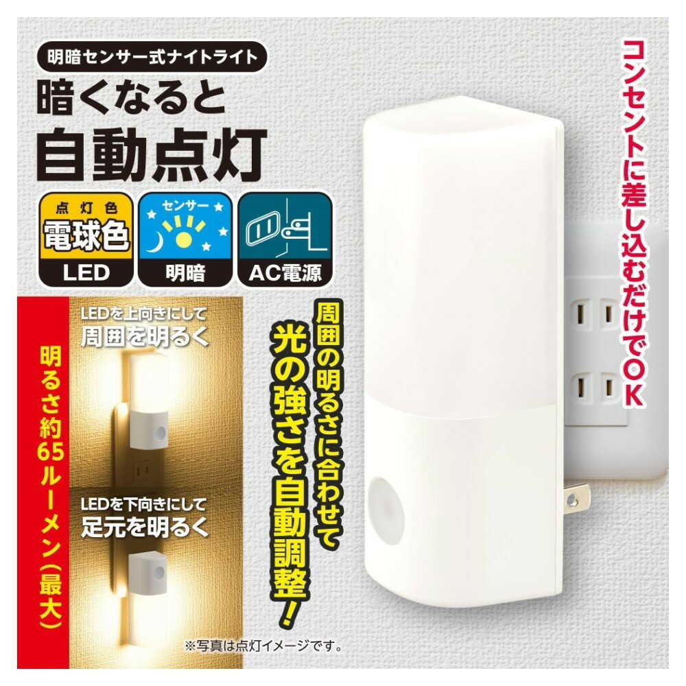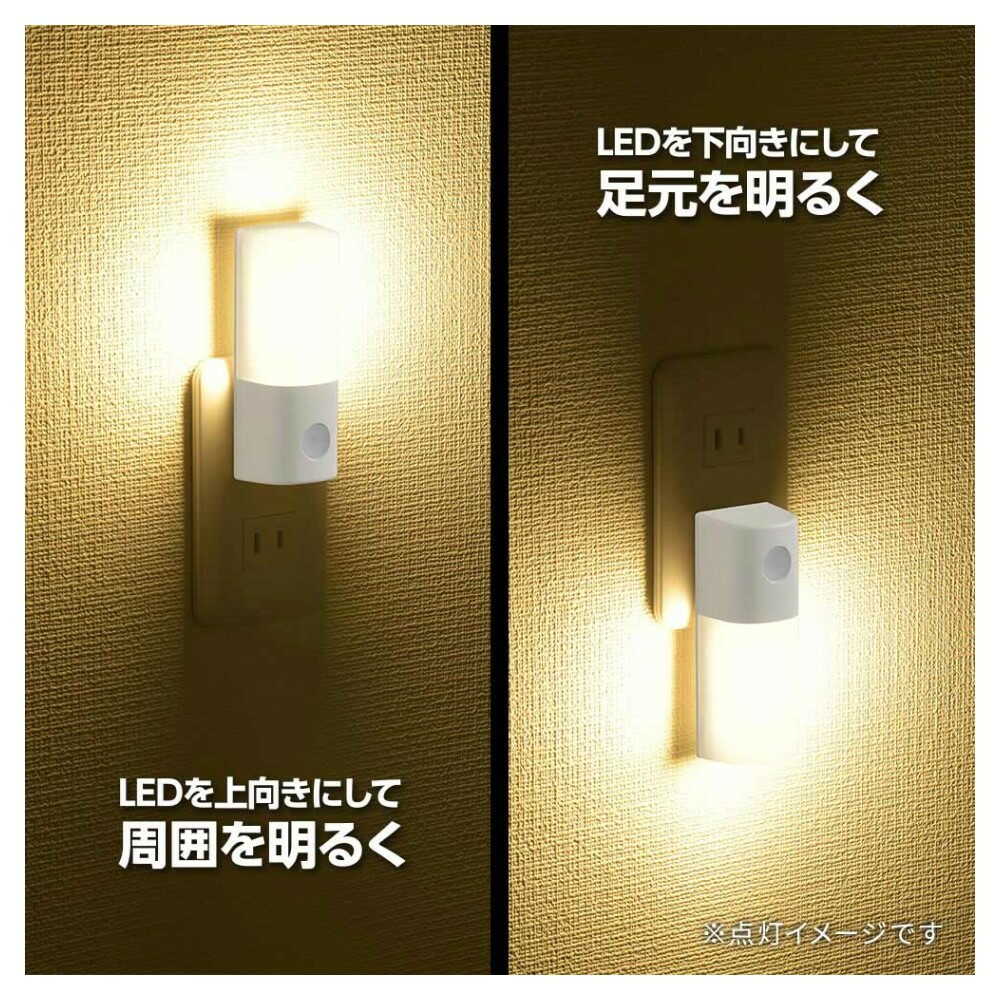 ●暗くなると自動点灯 ●LEDを上向きにして周囲を明るく ●LEDを下向きにして足元を明るく ●明るさ約65ルーメン(最大) ●周囲の明るさに合わせて光の強さを自動調整 ●コンセントに差し込むだけ