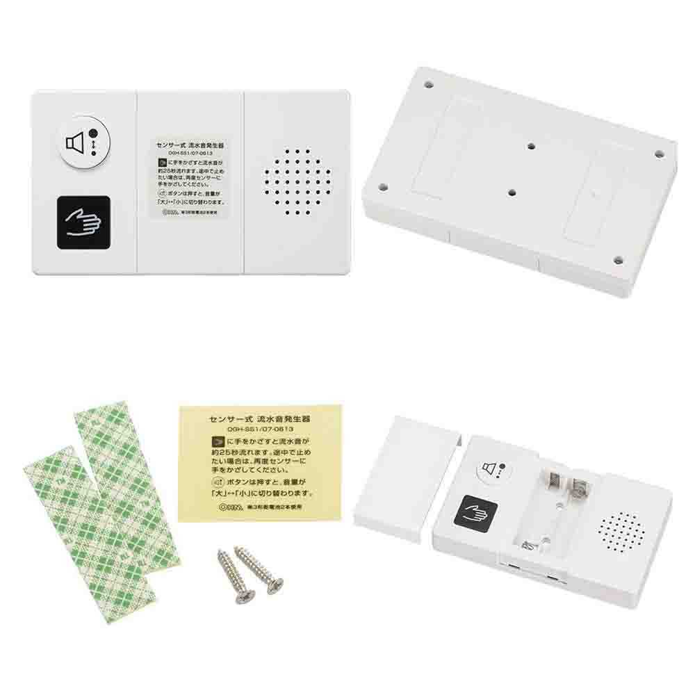 流水音発生器、センサー式、触れずに、衛生的、手をかざす、流水音、約25秒間、ご使用方法シール、音量2段階、単3形、乾電池式、かんたん取付