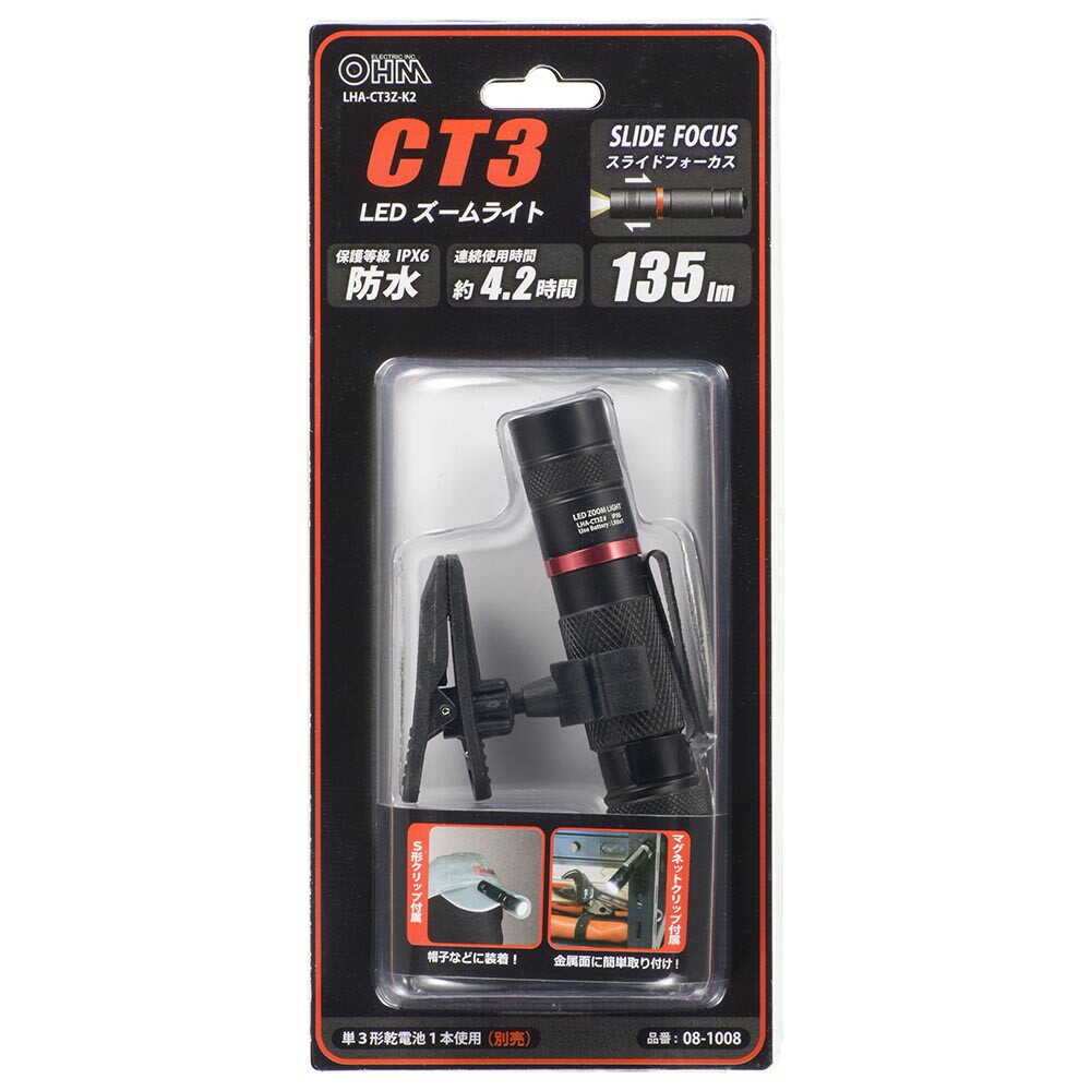S形クリップ、マグネットクリップ、スライドフォーカス機能付き、アルミボディ、保護等級IPX6、防水仕様