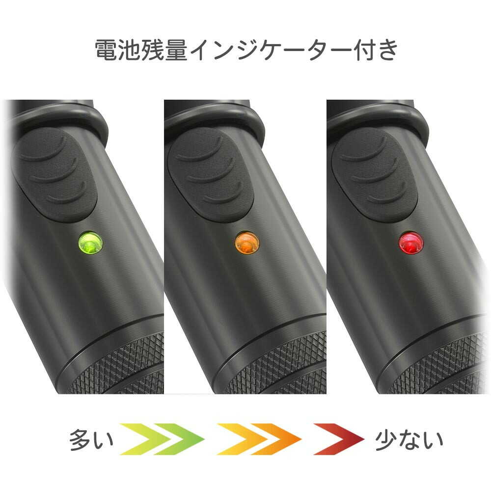 スライドフォーカス機能付き、調光機能2モード、保護等級IPX6、耐水形、1350ルーメン、10400カンデラ、電池残量インジケーター付き、携帯ストラップ付