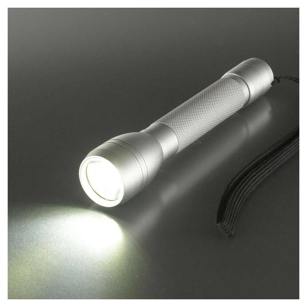 明るさ220ルーメン、連続使用時間約7時間、保護等級IPX4、照射距離約120m、携帯ストラップ付き、アルミボディ