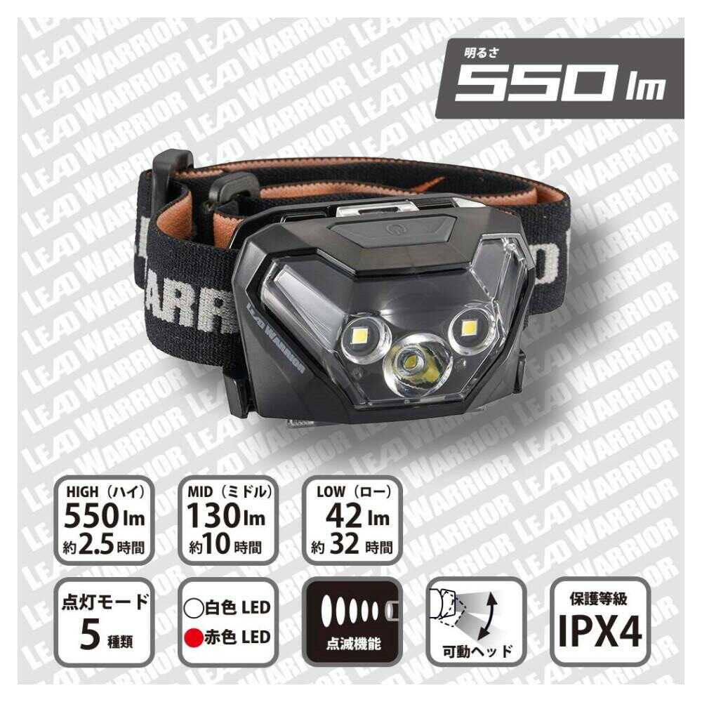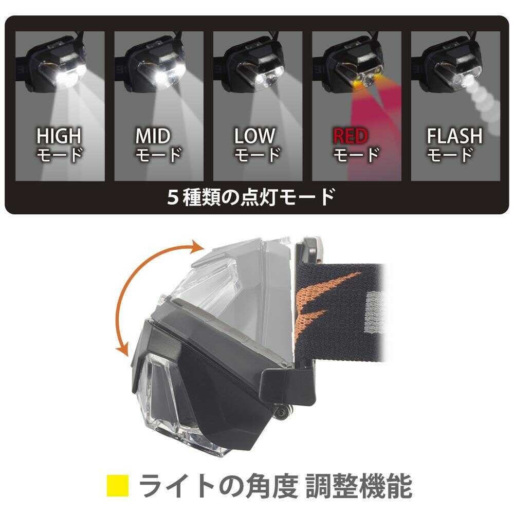 5種点灯モード、角度調整機能、1390カンデラ、約550ルーメン、連続使用時間約2.5時間、照射距離約74m、落下耐性約1m、IPX4、防まつ形