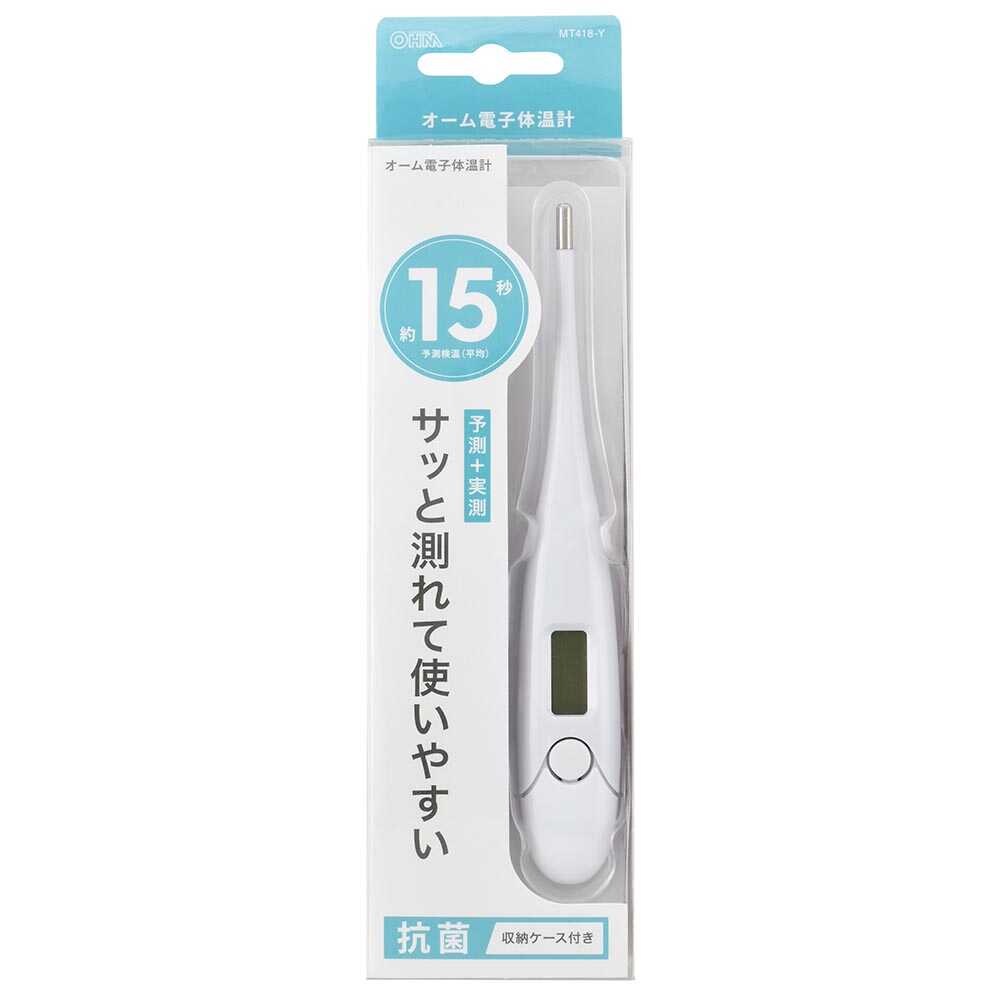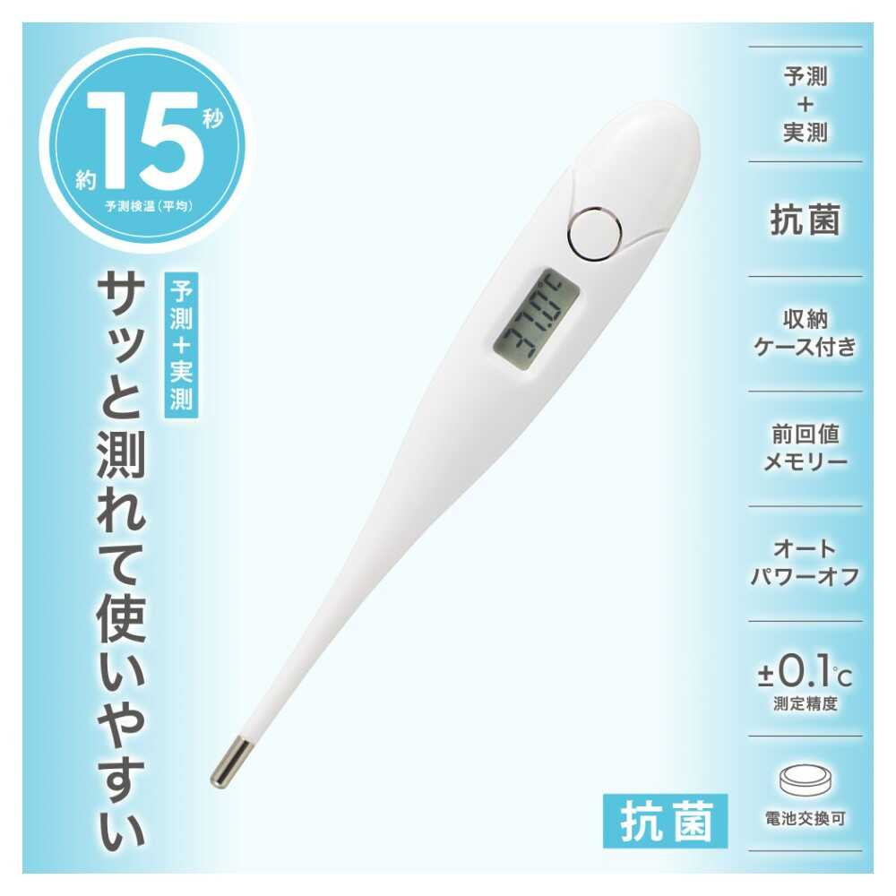 約15秒ですばやく予測検温、予測検温終了後も検温を続けると実測検温、検温終了時、予測、実測検温、電子音、ピー音でお知らせ、測定結果が37.8度以上、ブザーのリズムを変えてお知らせ、製品本体、抗菌剤入りの合成樹脂を使用、電源の切り忘れ、安心のオートパワーオフ式、測定精度は±0.1度、わきの下、口中で測定、電池交換可、収納ケース付き