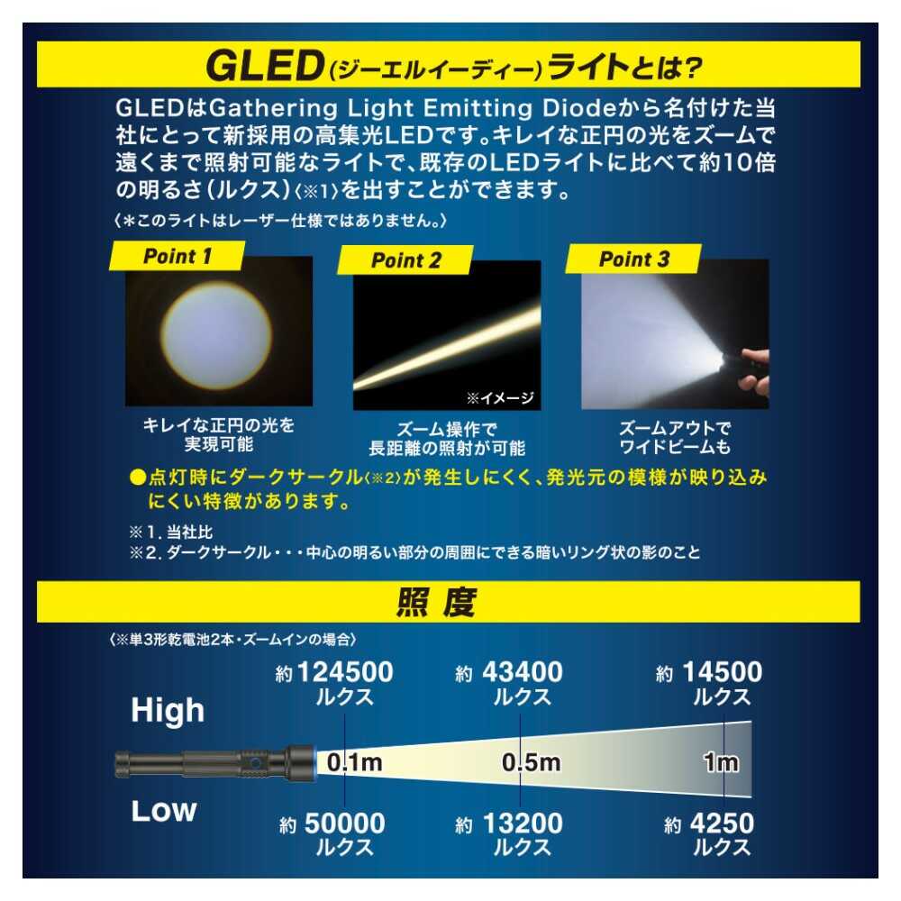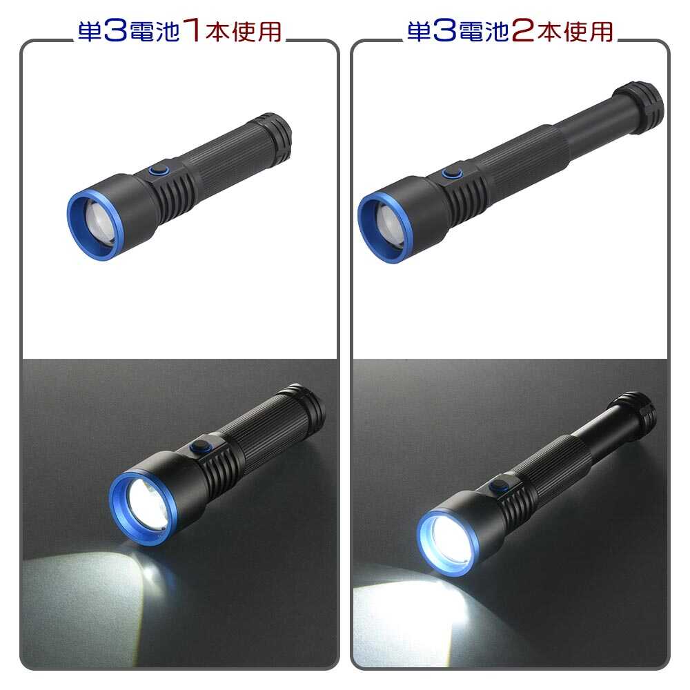 遠くまでキレイな光が届く、LEDライト、約10倍の明るさ、ルクス、ダークサークルが発生しにくい、キレイな正円の光、ズーム操作、長距離の照射が可能、最大照射距離、約245m、ズームアウト、ワイドビーム、明るさ調節機能付き、High、Low、点滅、全光束250ルーメン、単3形乾電池2本使用、単3電池1本、2本、使用可能