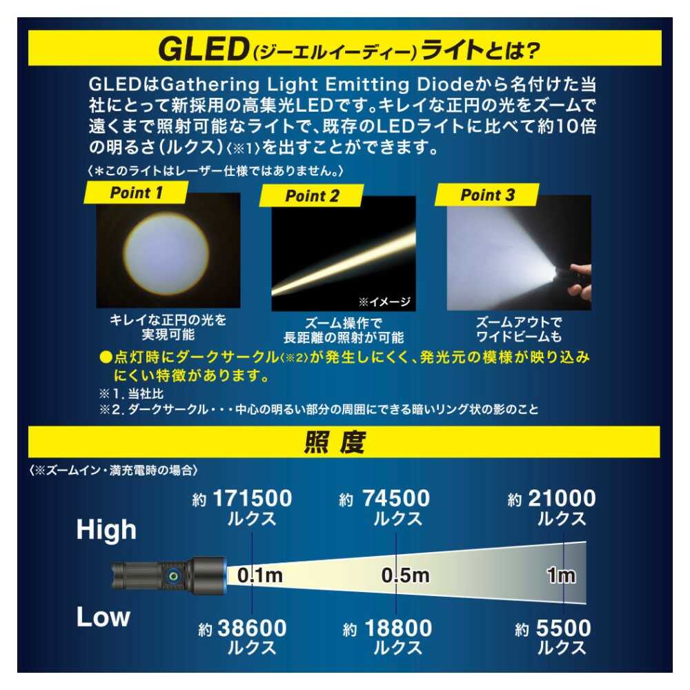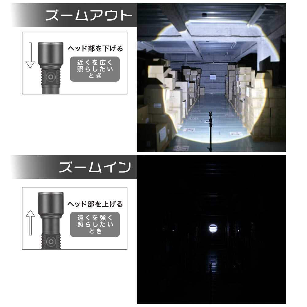 遠くまでキレイな光が届く、LEDライト、約10倍の明るさ、ルクス、ダークサークルが発生しにくい、キレイな正円の光、ズーム操作、長距離の照射が可能、最大照射距離約290m、ズームアウト、ワイドビーム、全光束550ルーメン、High、明るさ調節機能付き、Low、点滅、充電式、繰り返し使える、リチウムイオン仕様、残量が分かる、インジケータ付スイッチ
