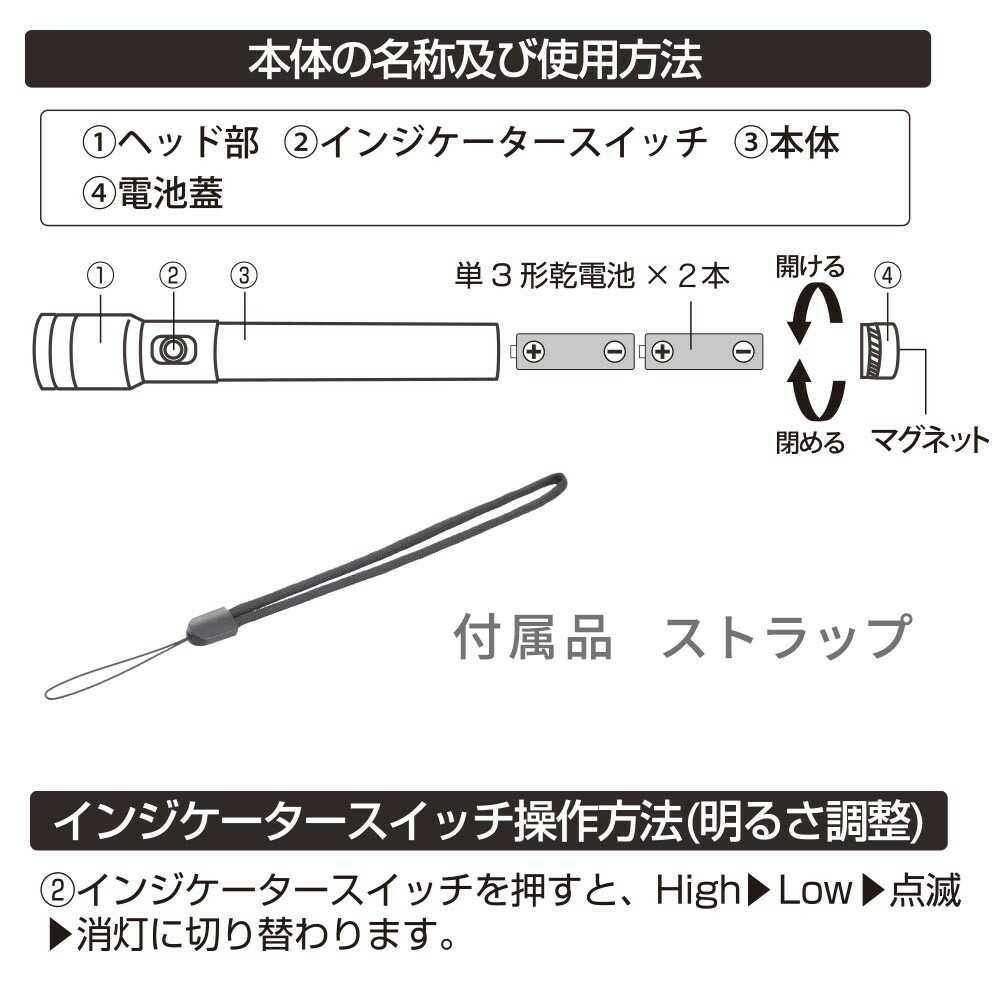 ズーム機能搭載、全光束300ルーメン、電池交換時期をお知らせ、インジケーター付き、保護等級IPX6、耐水形、連続点灯約11.5時間、マグネット付き