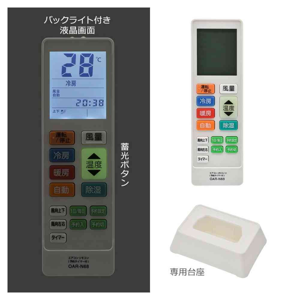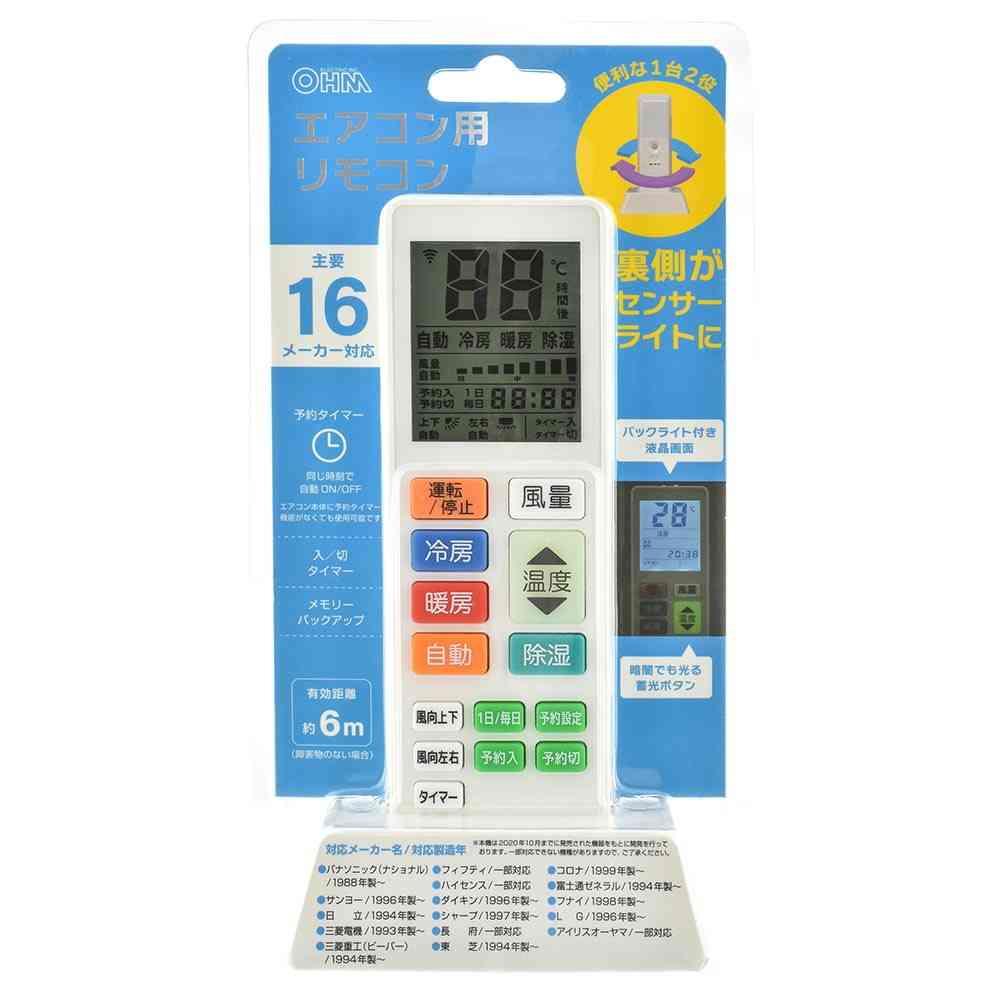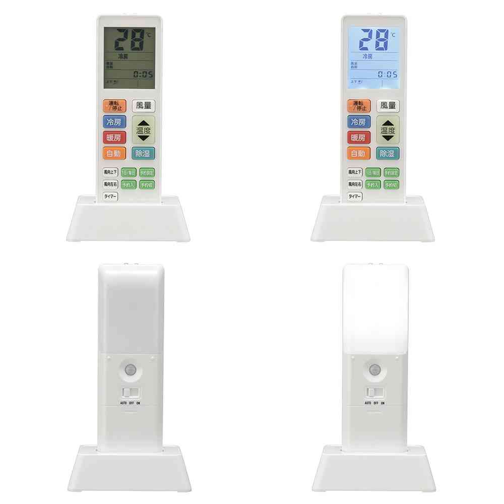 裏側がセンサーライト、エアコン用リモコン、主要16メーカー対応、予約タイマー機能付き、メモリーバックアップ機能付き、バックライト付き液晶画面、暗闇でも光る蓄光ボタン、センサーライト、点灯モードが選べる、手動でON、OFFもできる、AUTOモード、明暗、人感センサー、周囲が暗くなり人が近づくと点灯、ONモード、常時点灯