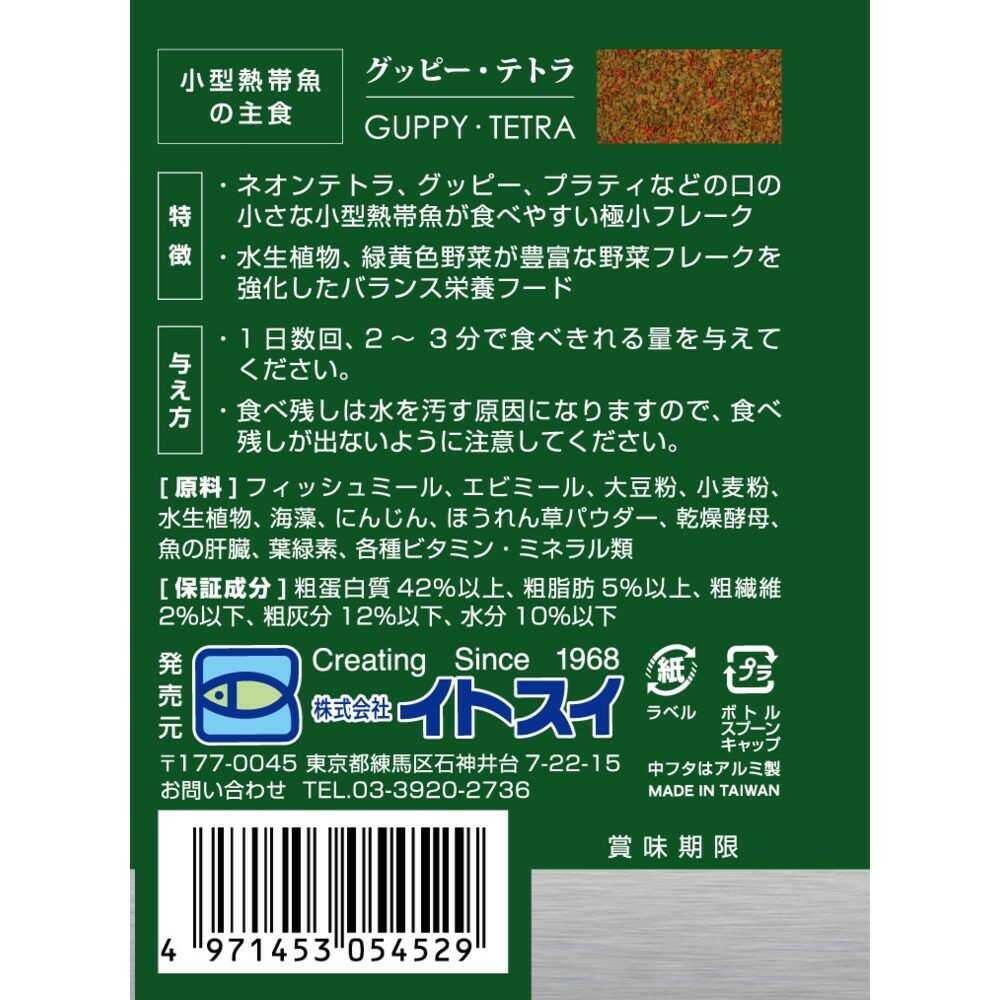 口の小さな小型熱帯魚が食べやすい極小フレーク。 野菜フレークを強化したバランス栄養フード。 スプーン付のボトルタイプで簡単に給餌可能です!
