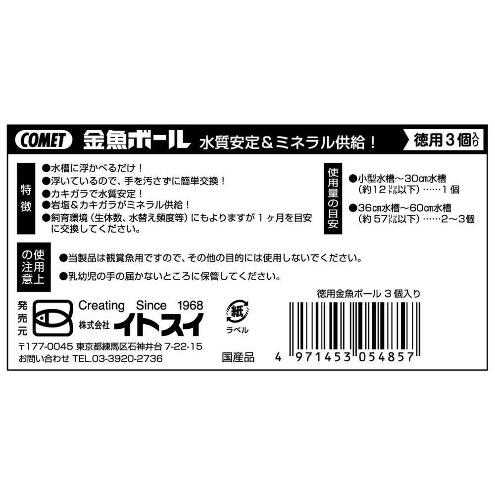 カキガラ入りで水質が安定します。 更に岩塩でミネラル供給! 徳用の3ヶ入り。 浮いているので交換が簡単です!!