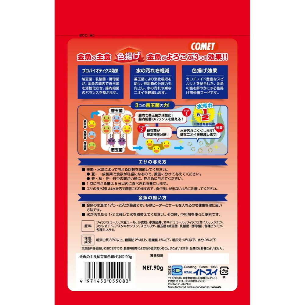 納豆菌、乳酸菌、酵母菌の3つの善玉菌の力で金魚の腸内細菌のバランスを整え、水の汚れや嫌なニオイを減らします。 更に金魚の色を鮮やかにするカロチノイド配合の色揚げ用栄養フード。 中粒タイプ。