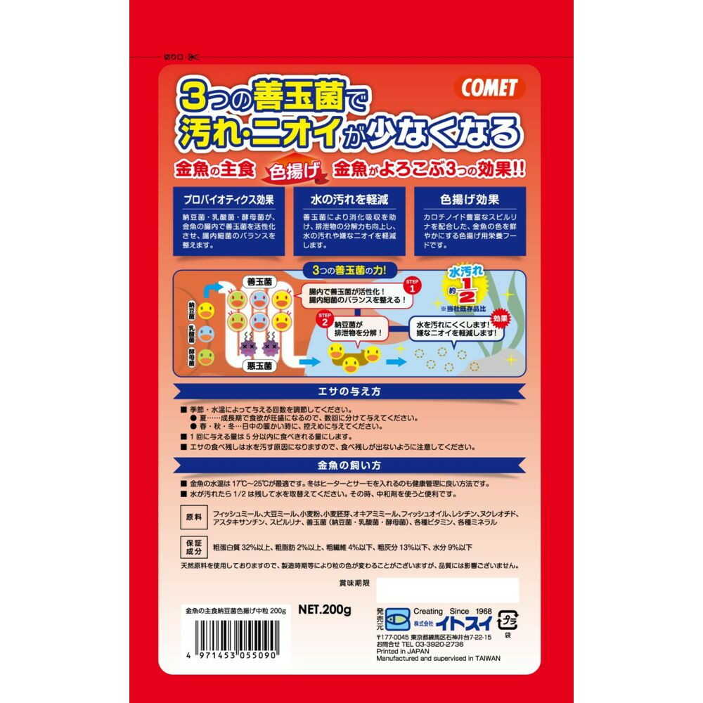 納豆菌、乳酸菌、酵母菌の3つの善玉菌の力で金魚の腸内細菌のバランスを整え、水の汚れや嫌なニオイを減らします。 更に金魚の色を鮮やかにするカロチノイド配合の色揚げ用栄養フード。 中粒タイプ。