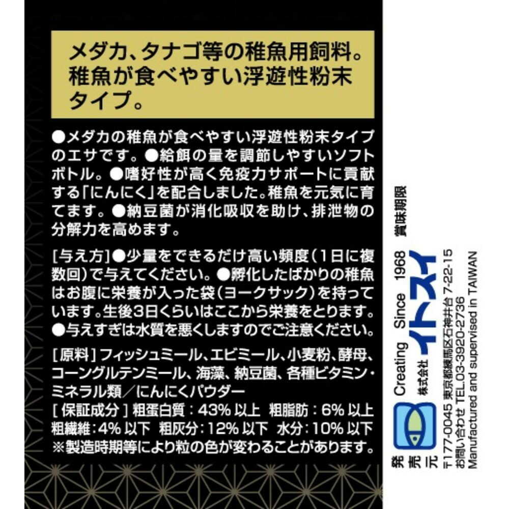 にんにく配合で嗜好性アップ、抗菌、殺菌効果により強く元気なメダカの育成。 納豆菌で消化吸収を助け排泄物の分解を向上。 稚魚が食べやすい粉末タイプ。