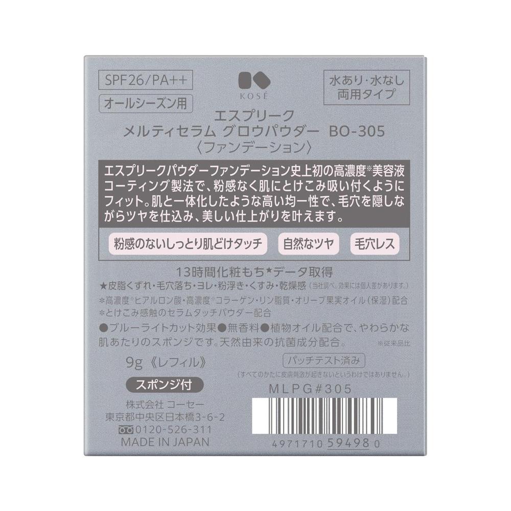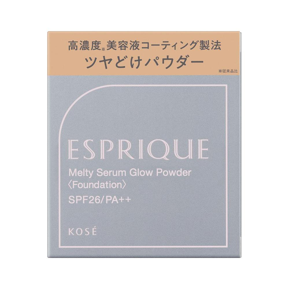 高濃度※美容液でコーティング、粉感なく肌に溶け込みフィットするパウダーファンデーション。 ツヤどけパウダー。 ※従来品比 SPF26・PA++ ■ リキッドファンデーションとフェイスパウダーで仕上げたような理想のツヤ肌を実現。肌と一体化するようなとけこみ感と高い均一性で、毛穴を隠しながらツヤを仕込み、美しい仕上がりを叶えるパウダーファンデーション。 ■ エスプリーク史上初、高濃度※美容液でコーティング。美容液で一粒一粒均一に包み込んだ粉体を乾燥させ、きめ細かく整え、新規プレス方法で時間をかけてプレスするコーセー史上最多工程の新製法。しっとりなめらかな肌どけタッチ・上品なツヤ・きめ細かく均一な薄膜で、自然なカバー力を叶えます。 ■ 弾力と透明性をもつ「セラムタッチパウダー」 配合。とけこみ感触で、凹凸に沿うように均一に密着するため、厚塗り感なく毛穴を自然に隠します。 ■ 仕上がりも使用感も粉感がなく、しっとりとしたツヤ肌に仕上げます。