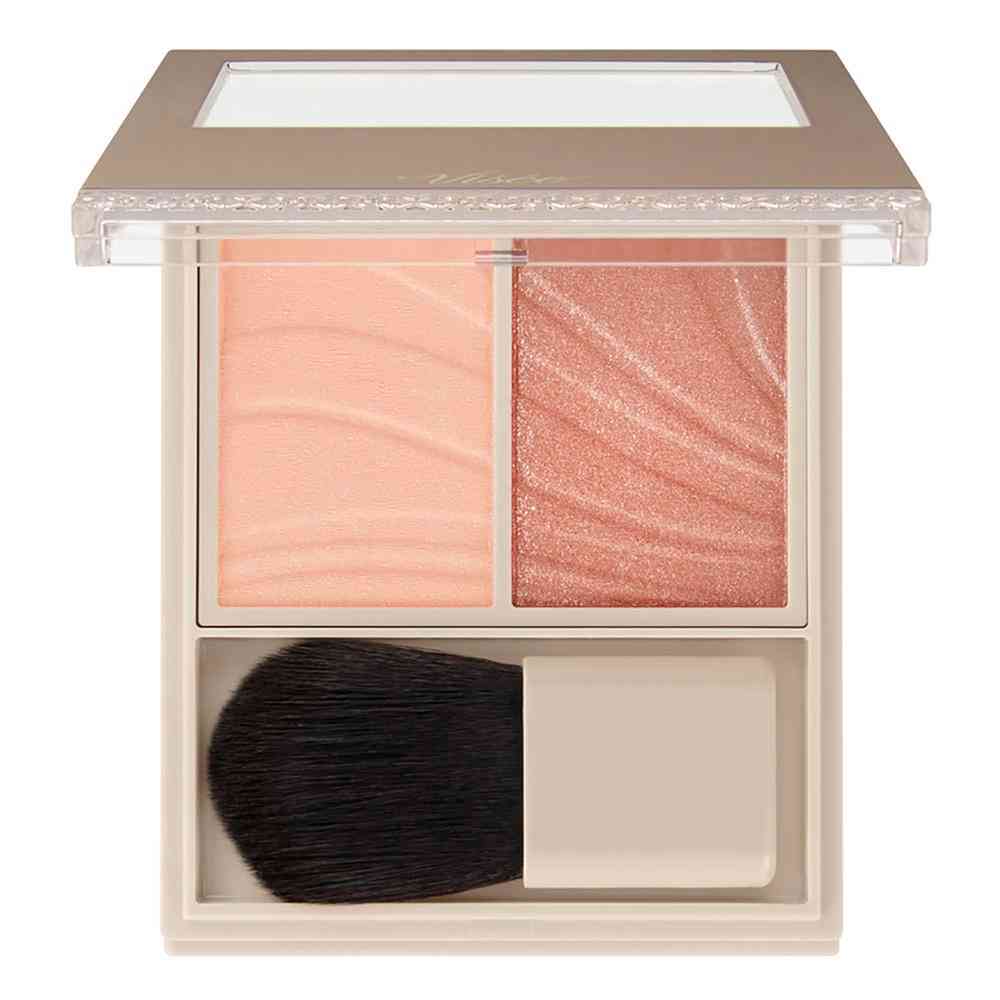 ベースで頬を整えて色を重ね、花びらのような血色感×立体ツヤを生み出す。 マットベースとパールカラーの2質感チークカラー。