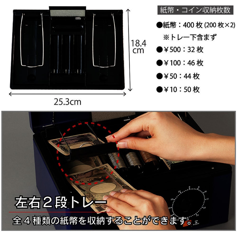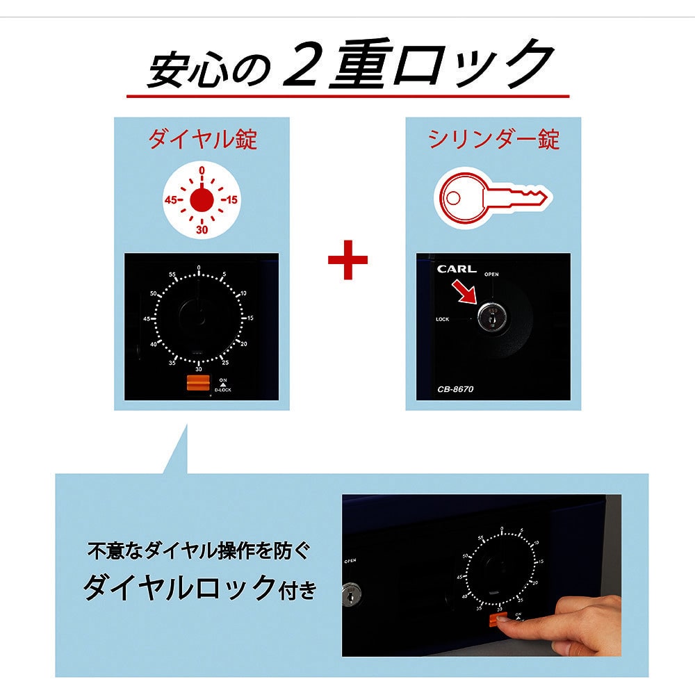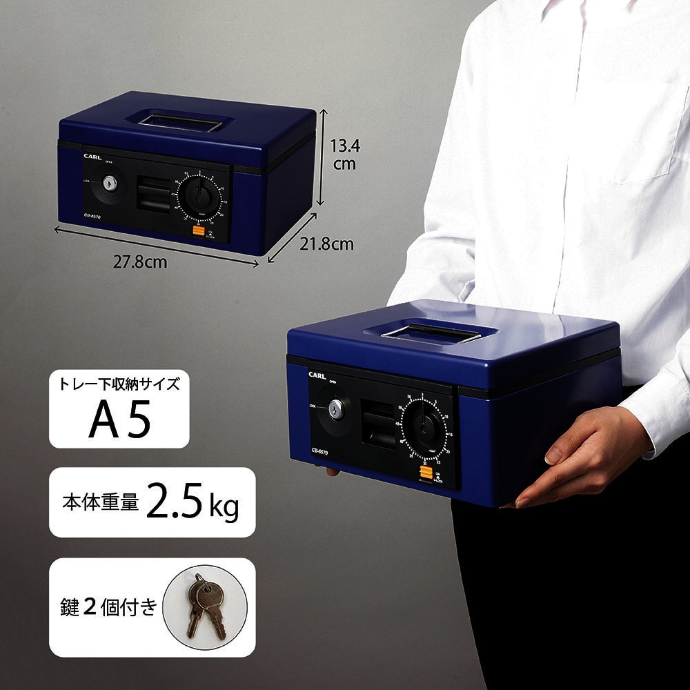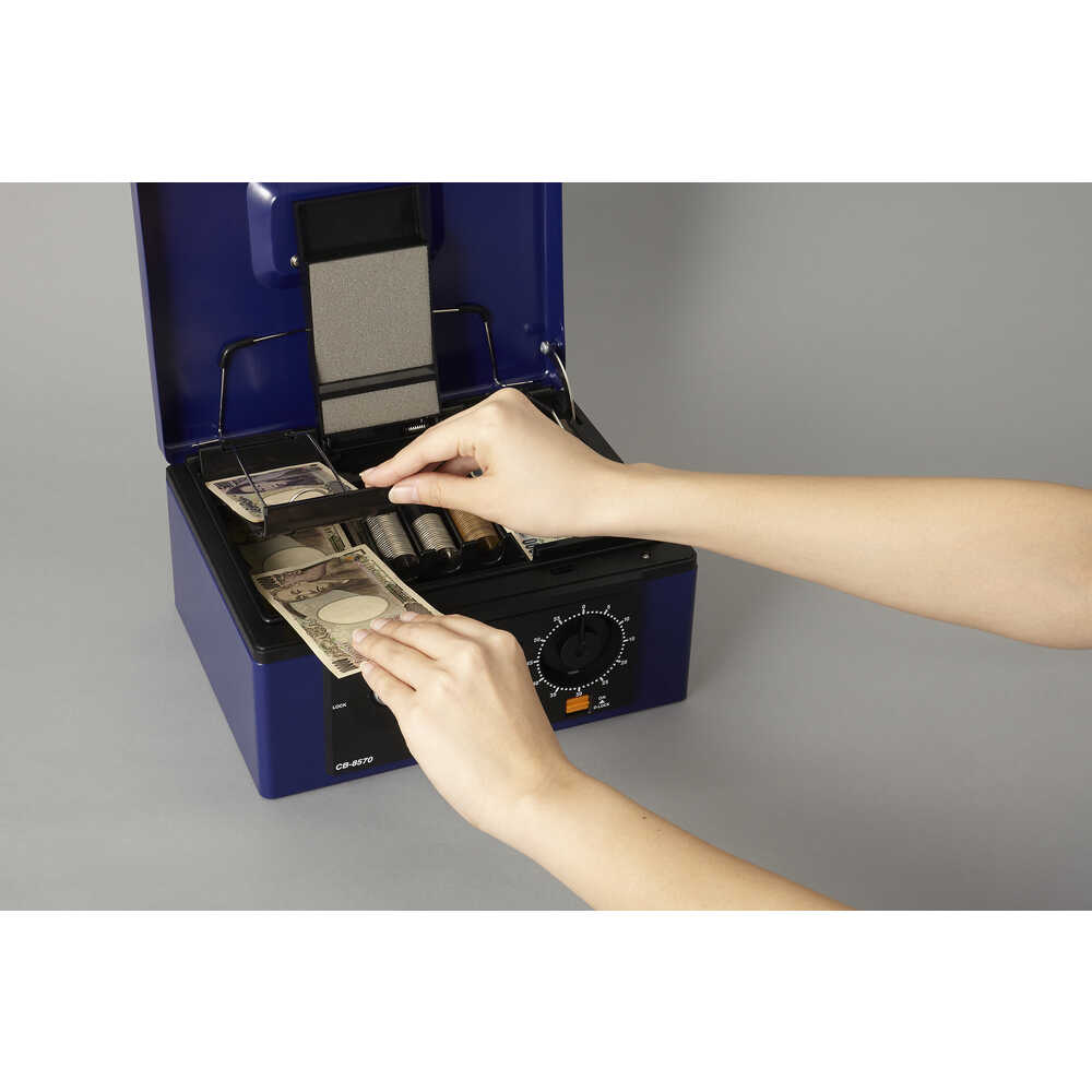 ●シリンダー錠とダイヤル錠の二重ロックで管理は万全です。●スポンジ付き内蓋により、持ち運び時に硬貨が飛散しません。●ダイヤルロック機能により、不用意なダイヤル操作を防ぎます。●左右の紙幣用トレーは2段式で4種類の紙幣を収納できます。●一時的な伝票整理に最適な書類押さえを装備しています。●トレーの下は領収書や契約書、認印等が収納できるフリースペースです。●硬貨収納枚数:500円32枚、100円46枚、50円44枚、10円50枚。●容量(L):2.9●色:ブルー●本体寸法(mm)間口:278●本体寸法(mm)奥行:218●本体寸法(mm)高さ:134●有効内寸(mm)間口:244●有効内寸(mm)奥行:168●有効内寸(mm)高さ:73●収納書類サイズ:A5サイズ●施錠:シリンダー錠、ダイヤル錠●仕様:ダイヤルロック機能、紙幣二段トレー、硬貨飛散防止、書類押さえ●硬貨収納枚数:500円32枚、100円46枚、50円44枚、10円50枚●A5サイズ収納●紙幣二段トレー●ダイヤルロック機能●書類押さえ 質量2.5kg