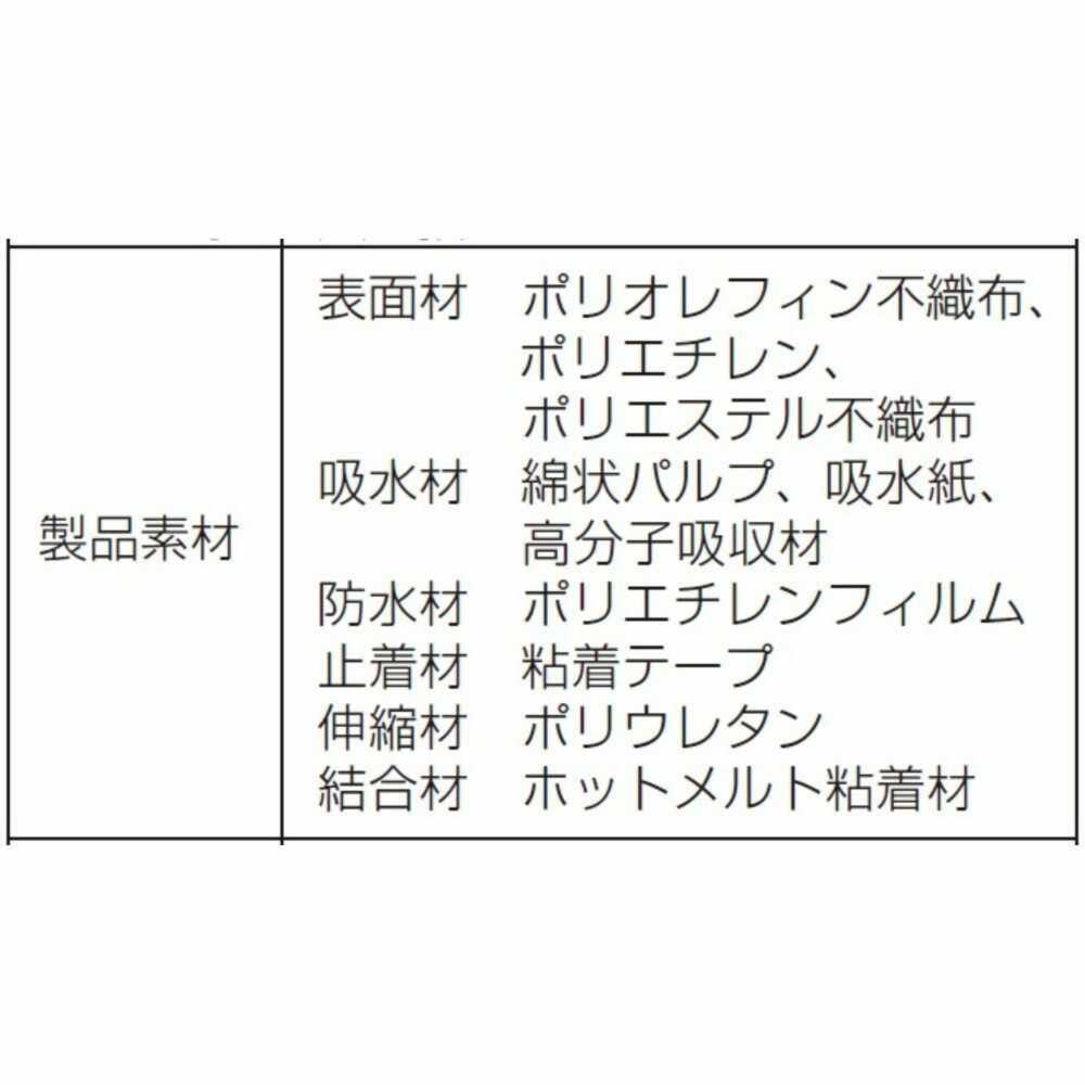 表面材:ポリオレフィン不織布、ポリエチレン、ポリエステル不織布 吸水材:綿状パルプ、吸水紙、高分子吸収材 防水材:ポリエチレンフィルム 止着材:粘着テープ 伸縮材:ポリウレタン 結合材:ホットメルト粘着材