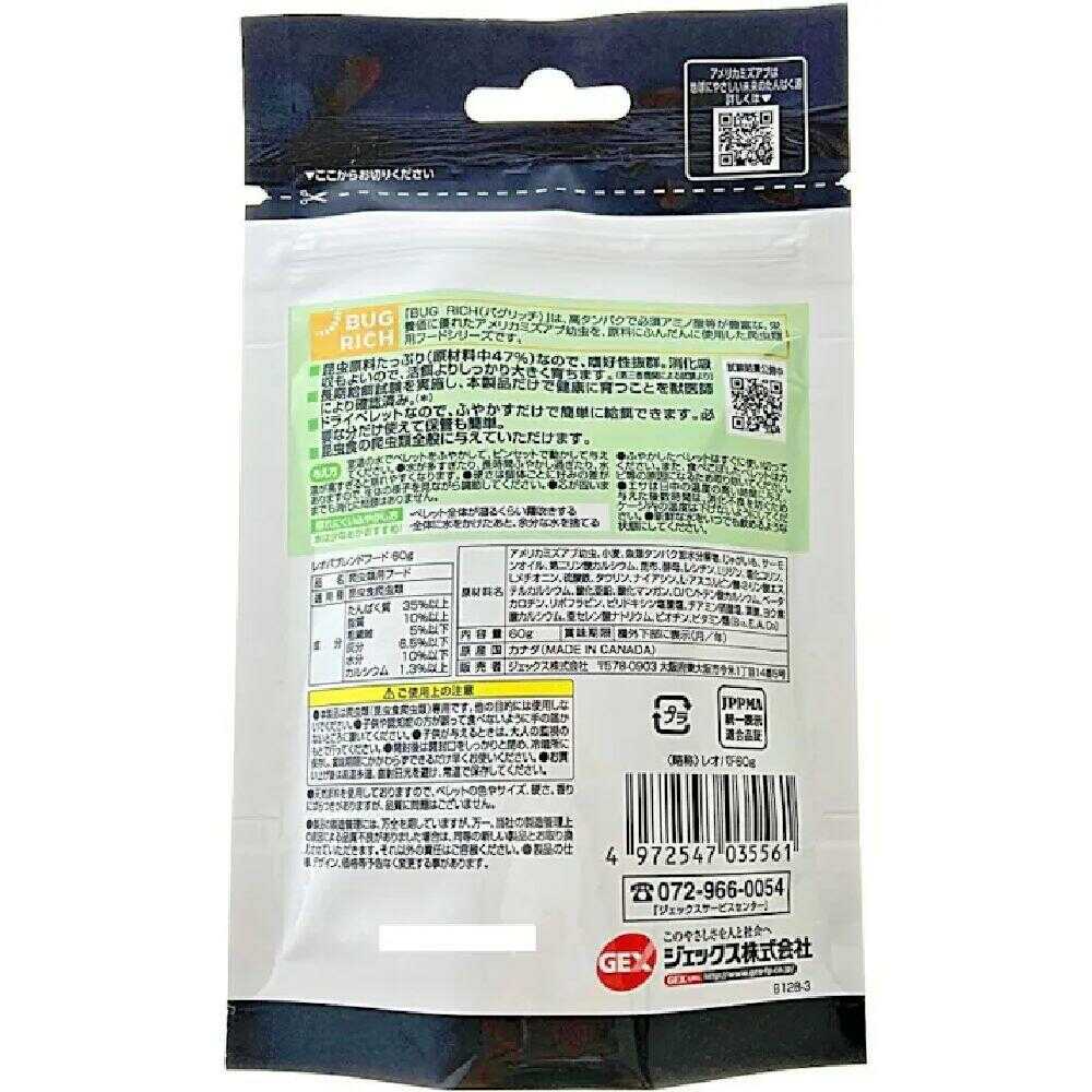 昆虫原料たっぷり(原材料中47%)なので、嗜好性抜群。 ドライペレットなので、ふやかすだけで簡単に給餌できます。必要な分だけ使えて保管も簡単。 昆虫食の爬虫類全般に与えていただけます。