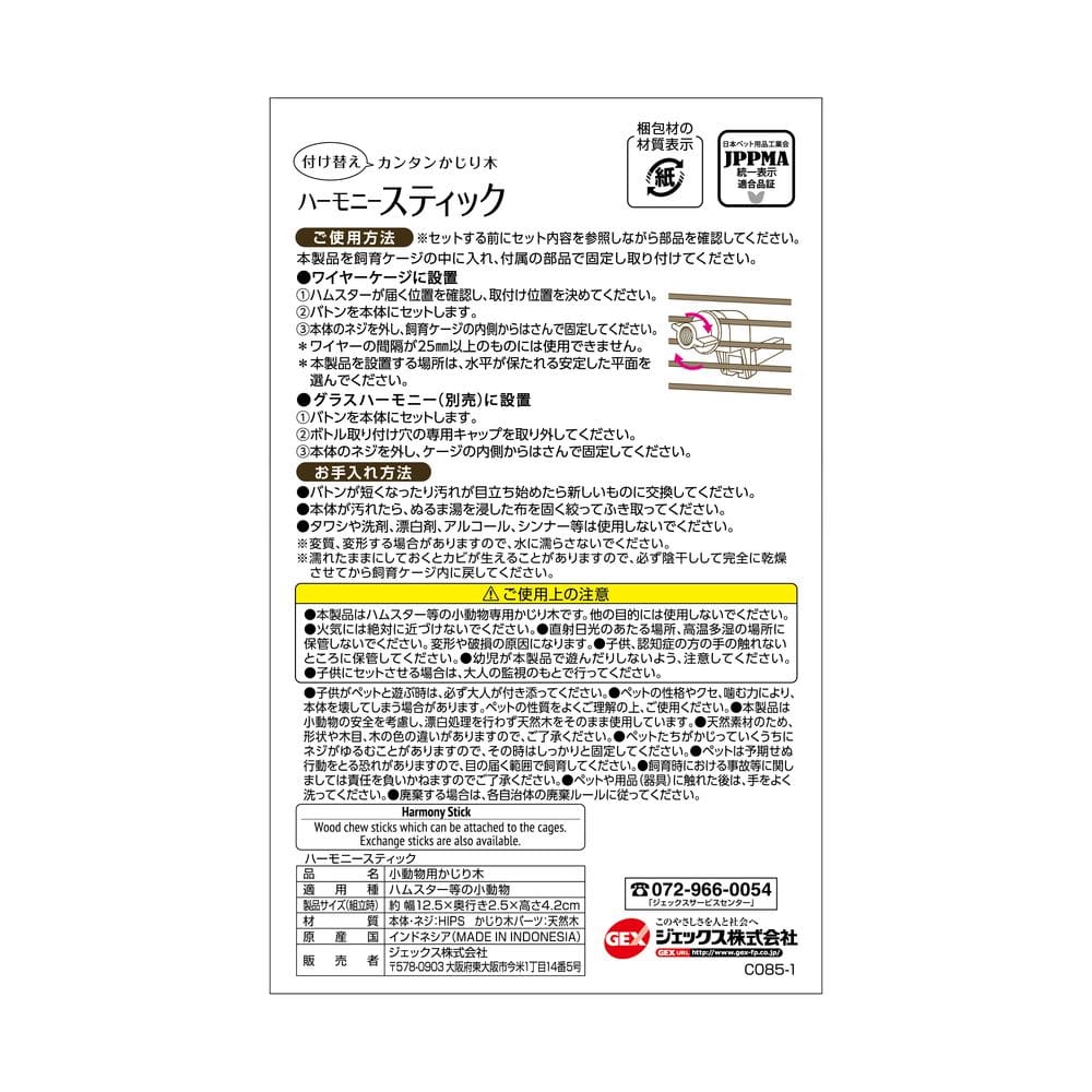 本製品はハムスター等の小動物専用かじり木です。他の目的には使用しないでください。火気には絶対に近づけないでください。直射日光のあたる場所、高温多湿の場所に保管しないでください。変形や破損の原因になります。子供、認知症の方の手の触れないところに保管してください。幼児が本製品で遊んだりしないよう、注意してください。子供にセットさせる時は必ず大人の監視のもとで行ってください。子供がペットと遊ぶ時は、必ず大人が付き添ってください。