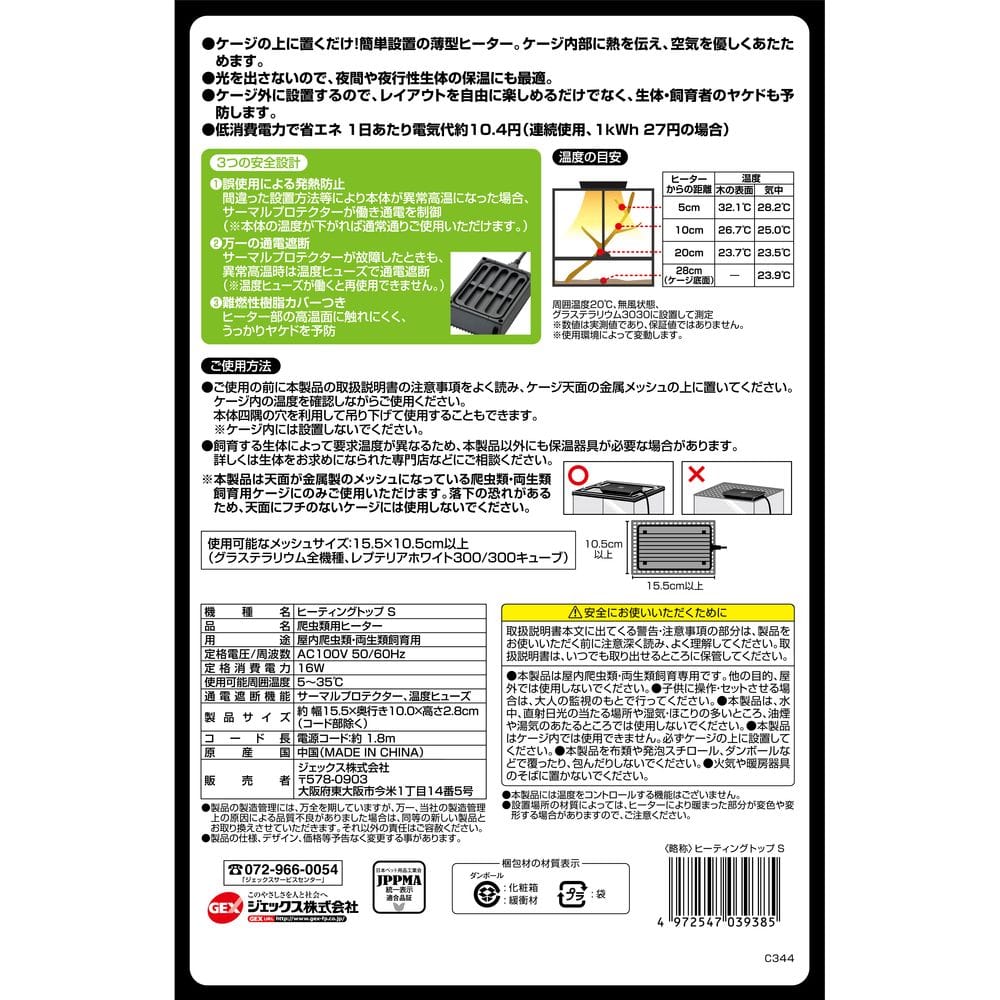 ●本製品は天面が金属製のメッシュになっている爬虫類・両生類飼育用ケージにのみご使用いただけます。落下の恐れがあるため、天面にフチのないケージには使用しないでください。使用可能なメッシュサイズ:15.5×10.5cm以上(グラステラリウム全機種、レプテリアホワイト300/300キューブ)●本製品には温度をコントロールする機能はございません。