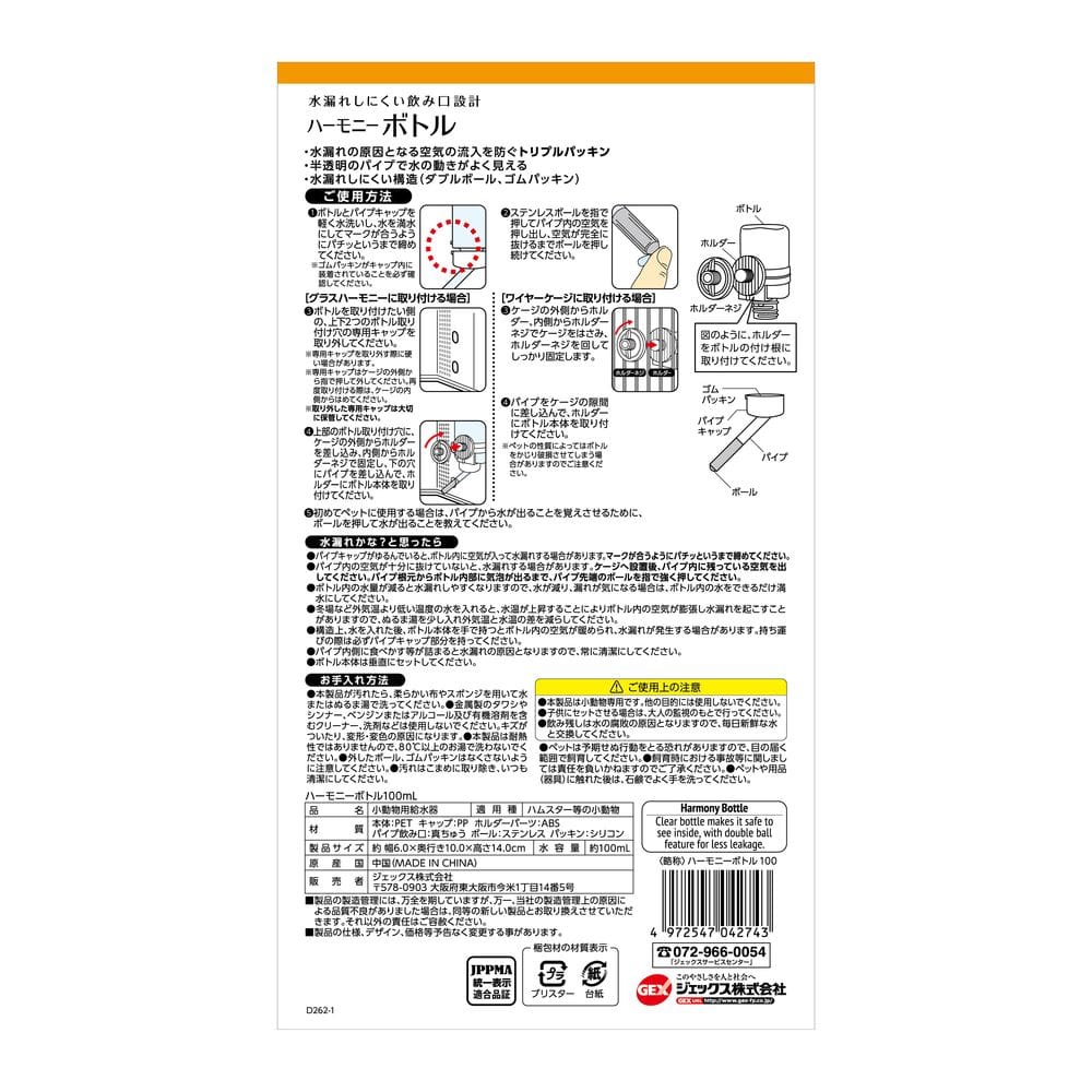 ●パイプキャップがゆるんでいると、ボトル内に空気が入って水漏れする場合があります。マークが合うようにパチッというまで締めてください。●パイプ内の空気が十分に抜けていないと、水漏れする場合があります。ケージへ設置後、パイプ内に残っている空気を出してください。パイプ根元からボトル内部に気泡が出るまで、パイプ先端のボールを指で強く押してください。●ボトル内の水量が減ると水漏れしやすくなりますので、水が減り、漏れが気になる場合は、ボトル内の水をできるだけ満水にしてください。●冬場など外気温より低い温度の水を入れると、水温が上昇することによりボトル内の空気が膨張し水漏れを起こすことがありますので、ぬるま湯を少し入れ外気温と水温の差を減らしてください。●構造上、水を入れた後、ボトル本体を手で持つとボトル内の空気が暖められ、水漏れが発生する場合があります。持ち運びの際は必ずパイプキャップ部分を持ってください。●本製品は耐熱性ではありませんので、80℃以上のお湯で洗わないでください。●外したボール、ゴムパッキンはなくさないように注意してください。