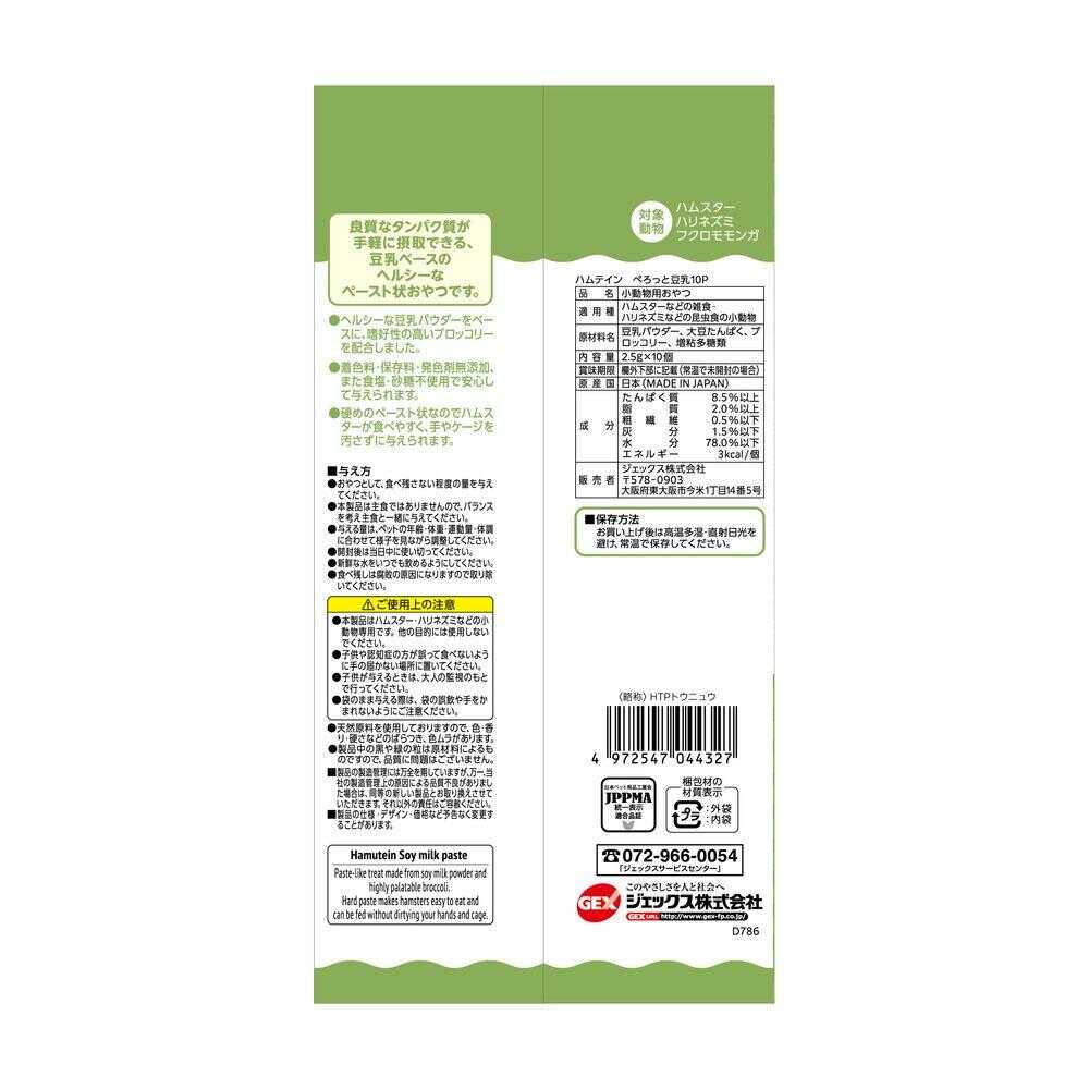 良質なタンパク質が手軽に摂取できる、豆乳ベースのヘルシーなペースト状おやつです。 ヘルシーな豆乳パウダーをベースに、嗜好性の高いブロッコリーを配合しました。 着色料・保存料・発色剤無添加、また食塩・砂糖不使用で安心して与えられます。 対象動物:ハムスター・ハリネズミ・フクロモモンガ