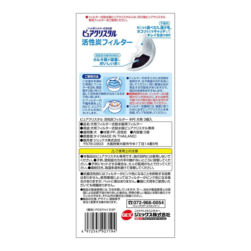 ●健康維持のため、フィルターは3週間から1ヶ月をめどに、または被毛や食べカス等の目に見える汚れが目立ったときに交換してください。●フィルター交換時には、清潔に保つために必ずピュアクリスタル本体各部、ポンプを洗浄してください。●フィルター式給水器ピュアクリスタルには、GEX製ピュアクリスタル専用フィルターをご使用ください。