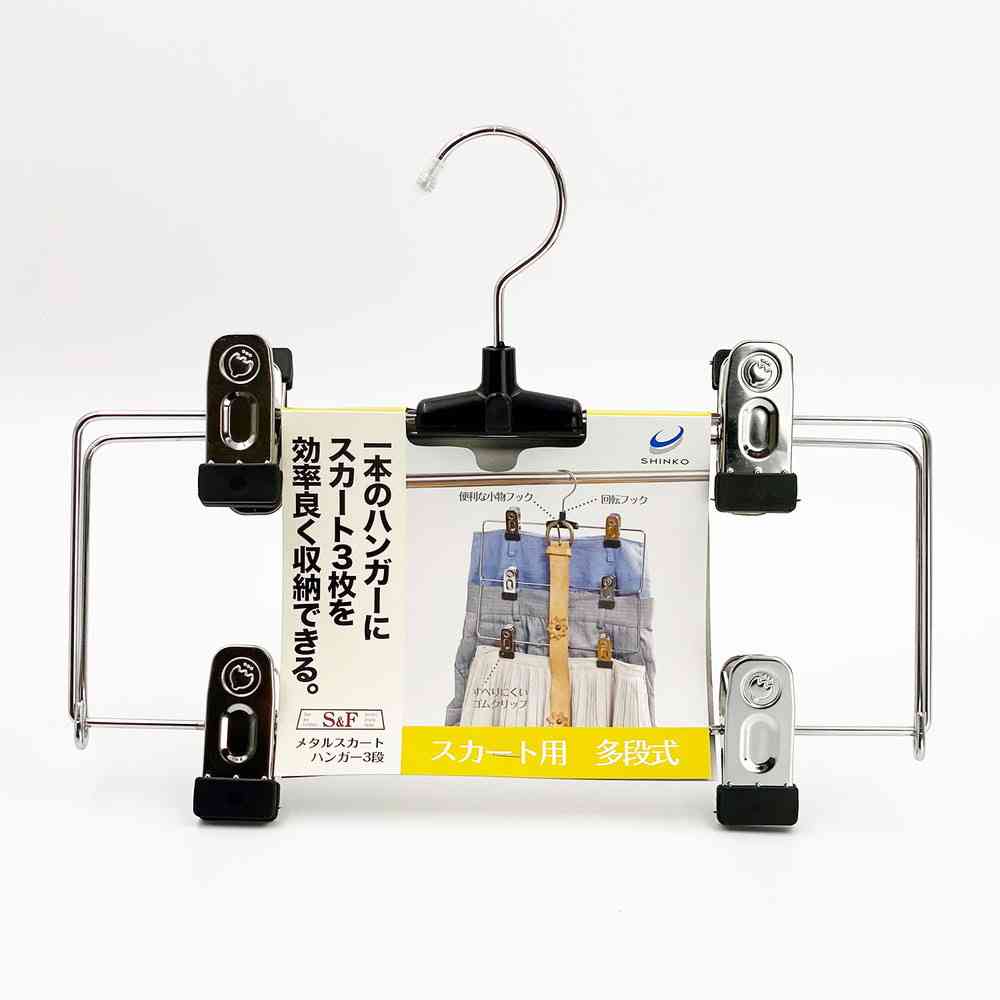 金属製クリップでボトムをしっかり固定できる、3枚掛け・3段式の金属製スカート用ハンガーです。 スカートを3本まとめてクリップでき、効率よく収納できます。 クリップの先端にはゴム製のすべり止めが付いており、スカートをしっかりキャッチします。 クリップ跡が残りにくいのも特長です。 フックは回転式で、中央の前フックにはベルトなどを掛けることもできます。