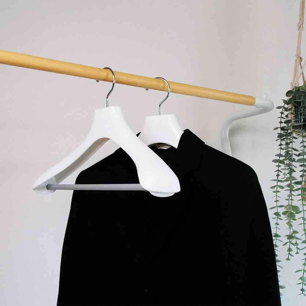 衣類収納をライフスタイルに合わせてトータルコーディネートできるジャケット用ハンガーです。 ホワイトカラーで衣類が映え、肩幅約390mmのサイズは女性にもおすすめです。 肩先の厚みは63mmとしっかりしており、衣類の型崩れを防ぎます。 滑り止めのストップバー付きで、スラックスなどを掛けてもずり落ちません。 フックは回転式で、向きを自由に変えられます。