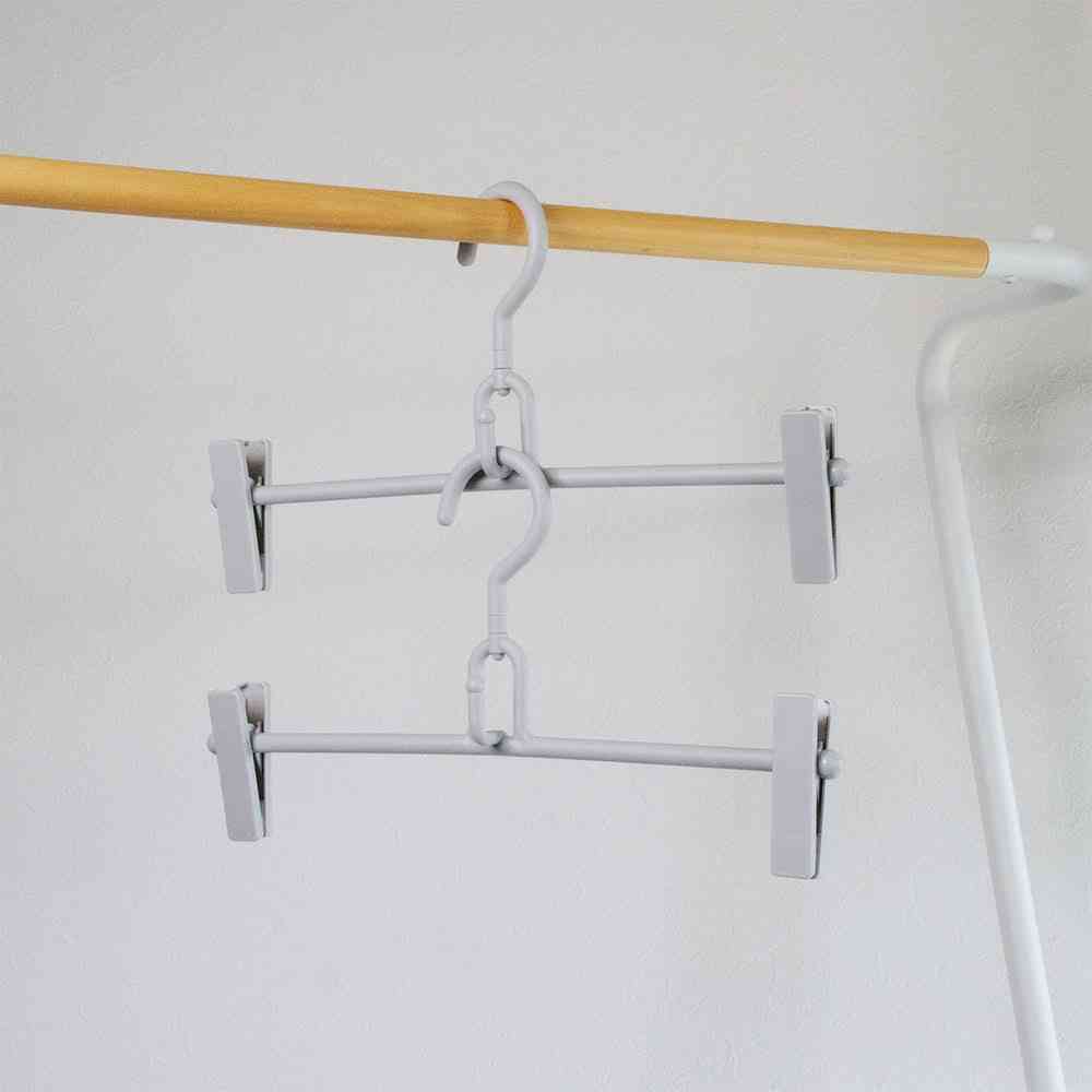衣類収納をライフスタイルに合わせてトータルコーディネートできる、スカート向けハンガー2本組です。 ハンガー同士が縦に連結でき、クローゼット内で効率よく収納できます。 滑り止めがついたクリップで、衣類をしっかり保持します。 フックは回転するタイプで、向きを変えられます。
