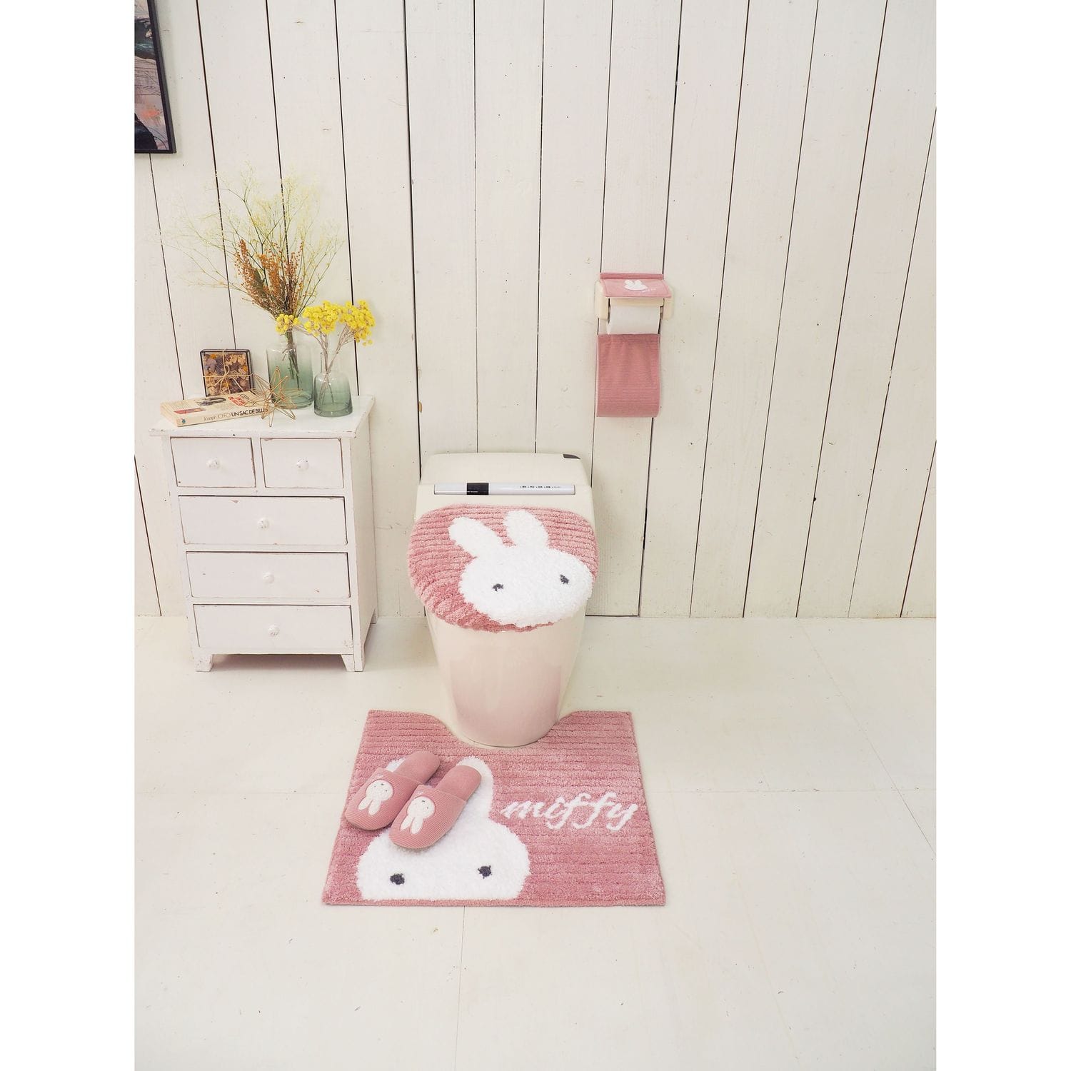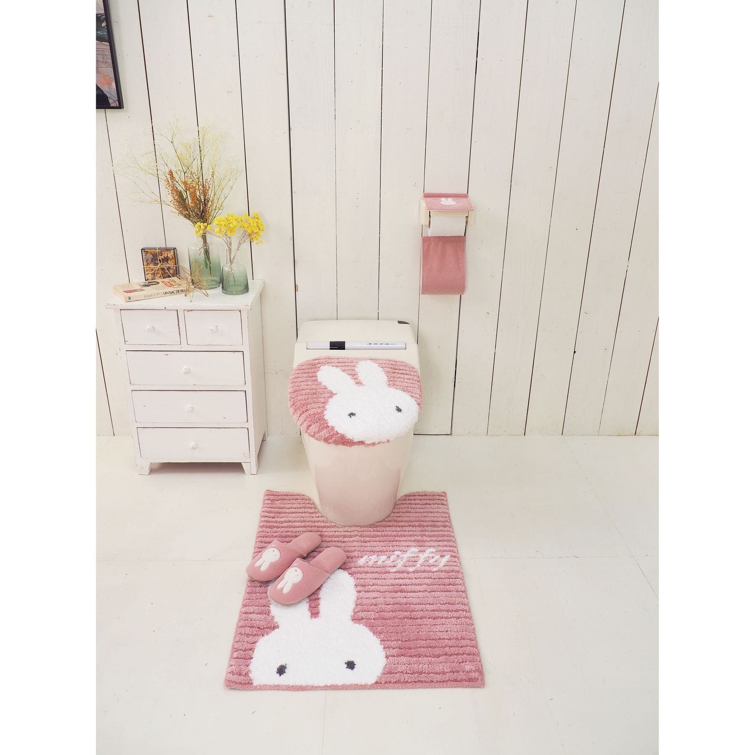 大人の女性に贈るシンプルなデザインとグレイッシュな色合い。「プリーマミッフィー」シリーズ。大人の女性に贈るシンプルなデザインとグレイッシュな色合い。柔らかな手触りの横リブ生地を使用。フラップ部分にふわふわのミッフィーのアップリケがついています。一本支柱タイプのホルダーにも対応しているペーパーホルダーカバー。(支柱の形状・サイズによっては取付できないものもございます)ストック部にはトイレットペーパーが1つ収納出来ます。洗濯機、手洗いでの丸洗いが可能です。(洗濯機をご使用の際は洗濯ネットに入れてください)