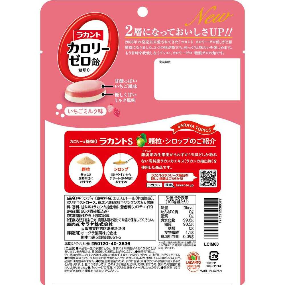 甘酸っぱいいちご風味と優しく甘いミルク風味の2層構造で、それぞれの味わいを濃く楽しむことができるカロリーゼロ飴。 ひんやり感が絶妙なバランスのいちごミルク味です。 羅漢果(ラカンカ)のやさしい甘さでカロリーゼロ・糖類ゼロ、1粒(約3g)当たりのロカボ糖質0g。