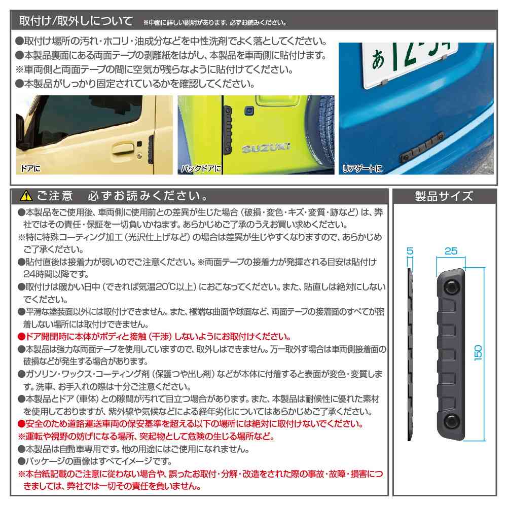 ●タフネスデザインでドアエッジをワイルドに演出する『 ロングサイズ 』のプロテクターです。 ●ロングサイズなのでドアだけでなく、バックドアやリアゲートなどのエッジ保護にも有効です。 ●無骨さを強調する飾り六角ボルトをあしらったデザインです。 ●オフロード車、SUV、ギア感のある車両などに最適です。 ●弾力がある軟質素材でドアエッジを傷から護り、他車への接触キズも防ぎます。 ●耐候性、耐摩耗性に優れた軟質樹脂を使用しています。 ●両面テープでボディ表面にぴったりと貼付くため、取付後、隙間に苔などが発生しにくい設計です。