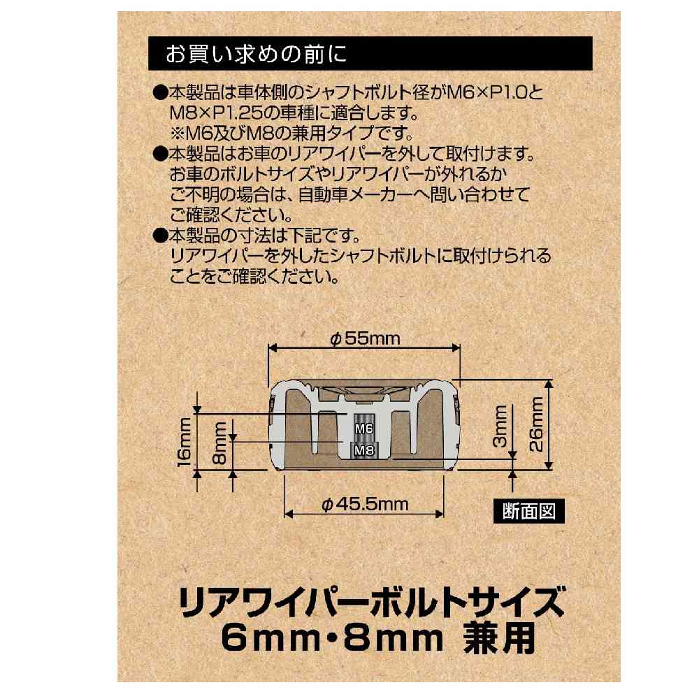 ●リアワイパーを外して取付けるドレスアップ用のリアワイパーキャップです。 ●見た目のインパクトと存在感を際立たせる無骨なオフロード用タイヤデザインです。 ●ドレスアップアイテムとして人気のホワイトレタータイヤに似せた外観です。 ●シャフトボルトを目立たせないデザインでリアビューのスムージング化に最適です。