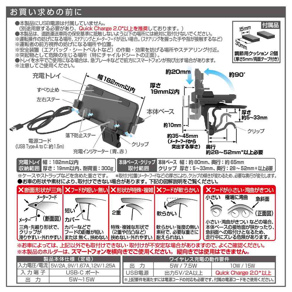 ●メーターフードに挟んで使用する取付け取外しが簡単なクリップタイプのワイヤレス充電トレイです。 ●横向きにスマートフォンを置く充電トレイで、簡単に収納できて充電もできます。 ●目の前に設置したスマートフォンは視線移動が少なく、画面を確認しやすいのでカーナビに最適です。 ●可動トレイは、スマートフォンを見やすい角度に無段階で調節(約0°~90°まで)でき、前方視界の妨げにならない高さに上下スライドで調節(約20mm)できます。 ●左右ステーと落下防止ステーにより、スマートフォンのズレや落下を防止します。