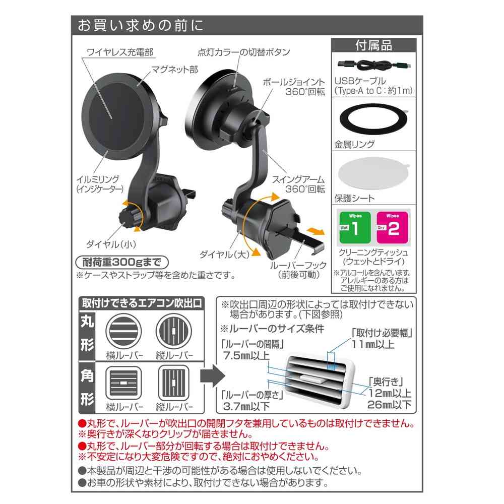 ●エアコンルーバー取付けタイプのワイヤレス充電機能付きマグネットホルダーです。 ●スイングアームとボールジョイントで、エアコン風を遮らない位置に調整が可能です。 ●イルミリング(インジケーター)搭載で夜間でもスマートフォンをホールドしやすいです。 ●ワイヤレス充電対応のスマートフォンをホールドするだけで、最大出力15Wの高速充電が可能です。 ●ルーバーを壊さない締め過ぎ防止機構で簡単にしっかり取付けできます。