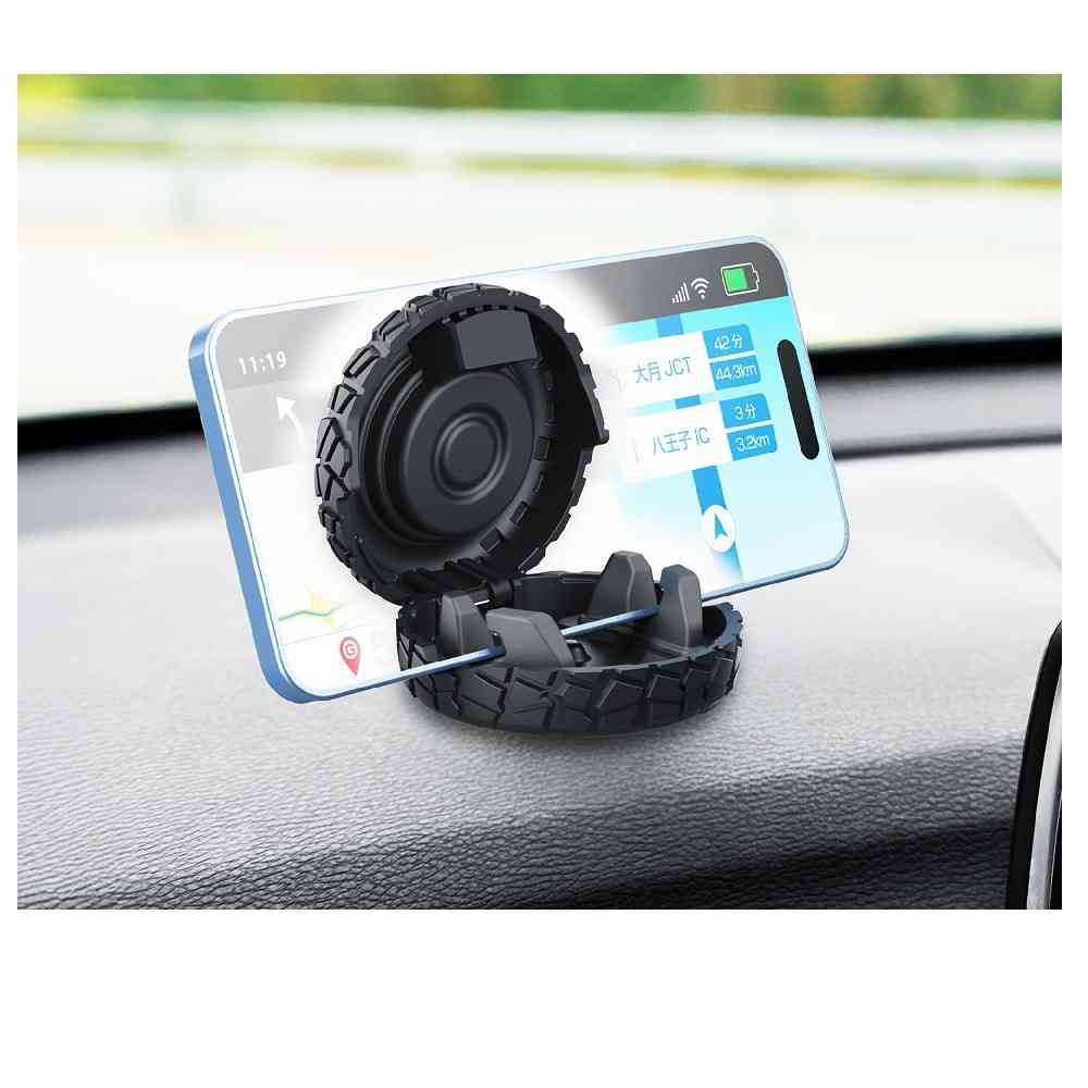 ●オフロード用タイヤデザインの置き型スマートフォンスタンドです。 ●ゴムスタンドに差し込むだけで、スマートフォンをしっかりとホールドできます。 ●フタ付きなので使わない時はコンパクトになります。 ●走行中の安定感とスマートフォンの着脱のしやすさを両立しています。 ●両面テープで簡単に設置でき、車内・オフィス・家庭でも使用可能です。 ●設置後も向きを変えられる回転機構付きです。
