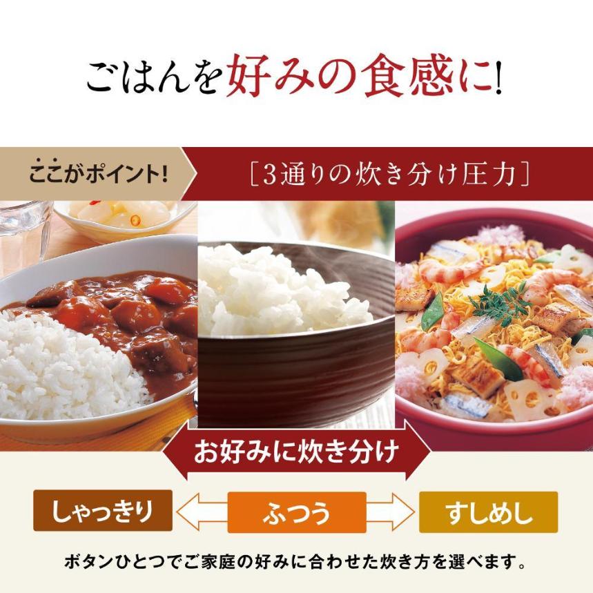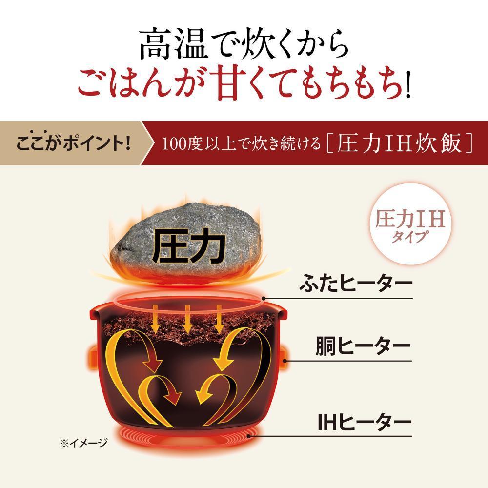 ■好みの触感に炊き分ける3通りの「炊き分け圧力」 ■ふきこぼれを抑え、大火力を実現する「大火力ユニット」 ■お手入れカンタン「蒸気口セットなし」「フラットトップパネル」「フラットフレーム」 ■おいしさ引き出す「うまみ圧力蒸らし」 ■30時間おいしく保温できる「うるつや保温」 ■おいしく炊ける「無洗米」メニュー
