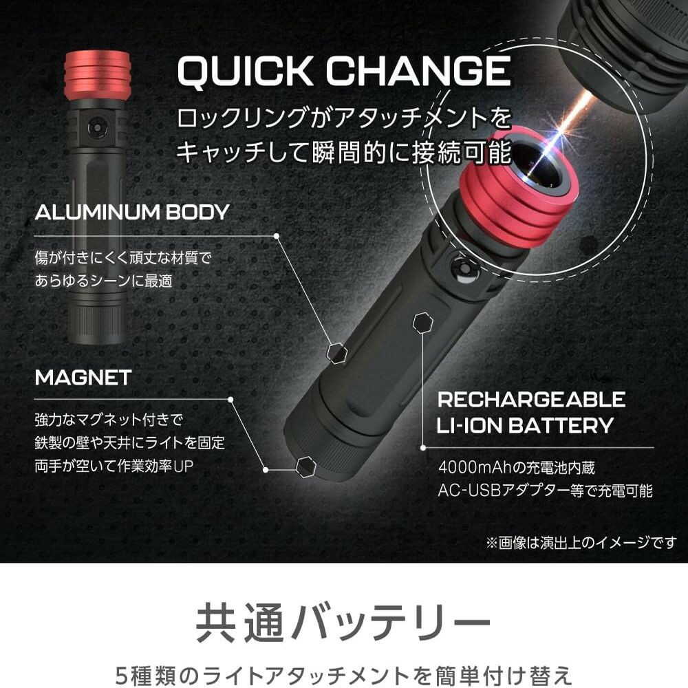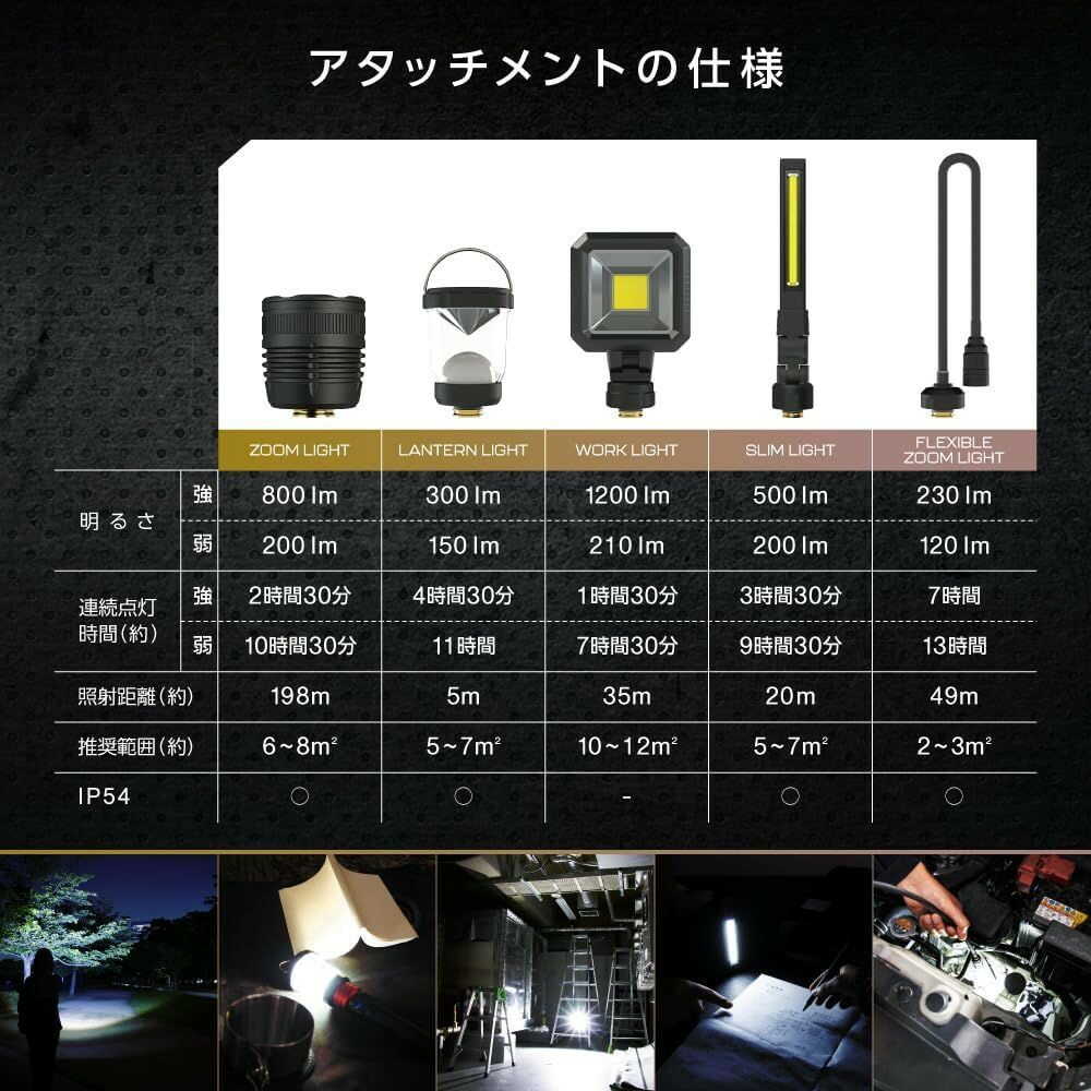 ●種類のアタッチメントが付属している多機能ライト ●USBType-Cで充電可能 ●最大1200ルーメンの明るさを提供し、高輝度実現 ●持ち運びに便利な軽量設計