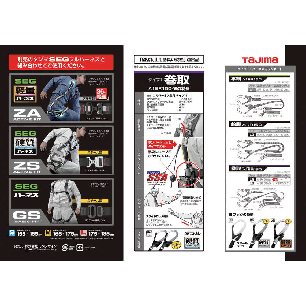 ●作業の邪魔にならない両側巻取式を採用した超小型巻取式(ロック機能なし)です。●上出しダブルL2ランヤードです。●ランヤードが引っ掛からないリール式です。●背中ベルト固定式ショックアブゾーバで手元が軽いです。●巻取器のスライドにより、好みのランヤード長に調整可能です。●ランヤードが絡まりにくいより戻し付きです。●最大使用可能質量(kg):100●幅(mm):16.5●長さ(mm):1500●フック口開き(mm)人体側:9●フック口開き(mm)構造物側:55●色:黒●フックタイプ:L2(高耐久スチール/より戻し)●タイプ:ダブル●ランヤード寸法幅(mm):16.5●ランヤード寸法長さ(mm):1500●厚生労働省「墜落制止用器具の規格」規格品●ランヤード種別:タイプ1●種類:フルハーネス型●ショックアブゾーバ種別:第一種(4kN)●最大自由落下距離:2.3m 質量1750g
