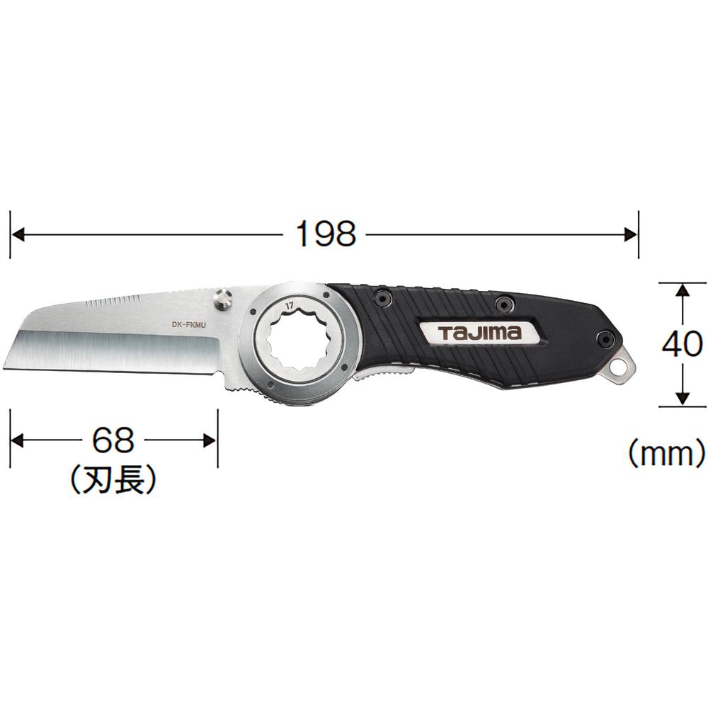 ●カラビナに掛けられる便利な装備性をもっています。●便利なソケット機構17×21(仮締め)付きです。●手袋着用でも滑りにくいエラストマーグリップ仕様です。●縦割きでも切り渋らないホロー刃形状です。●全長(mm):198●刃長(mm):68●幅(mm):198●ホルダー色:黒●レンチ機能付●リングスリーブ(小)保持用穴:φ5.2mm 質量188g
