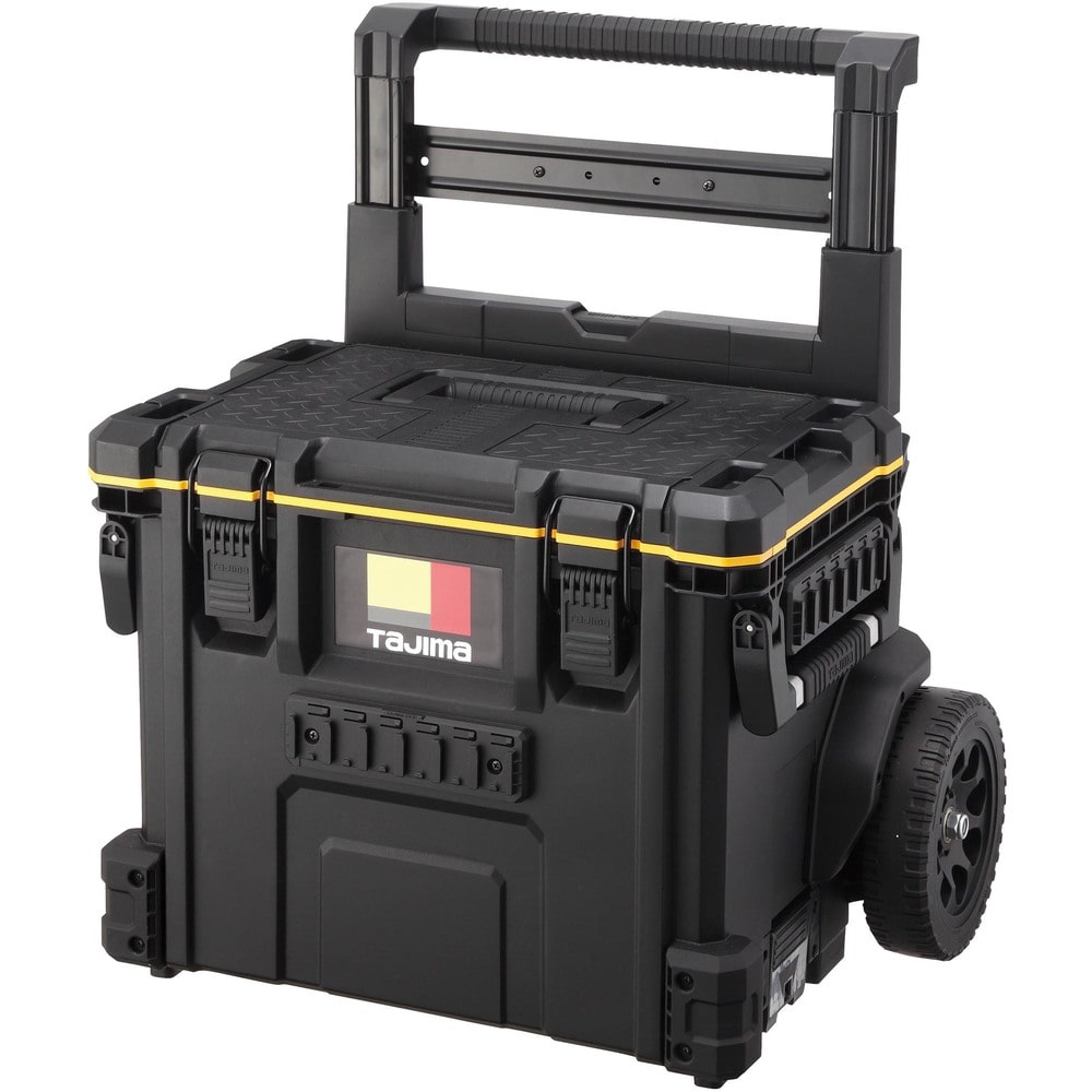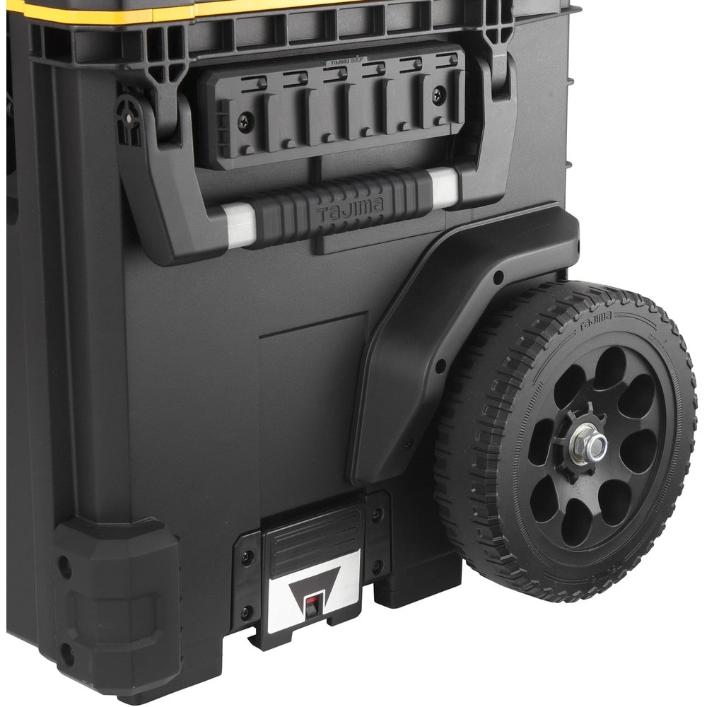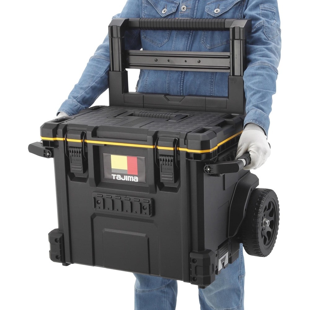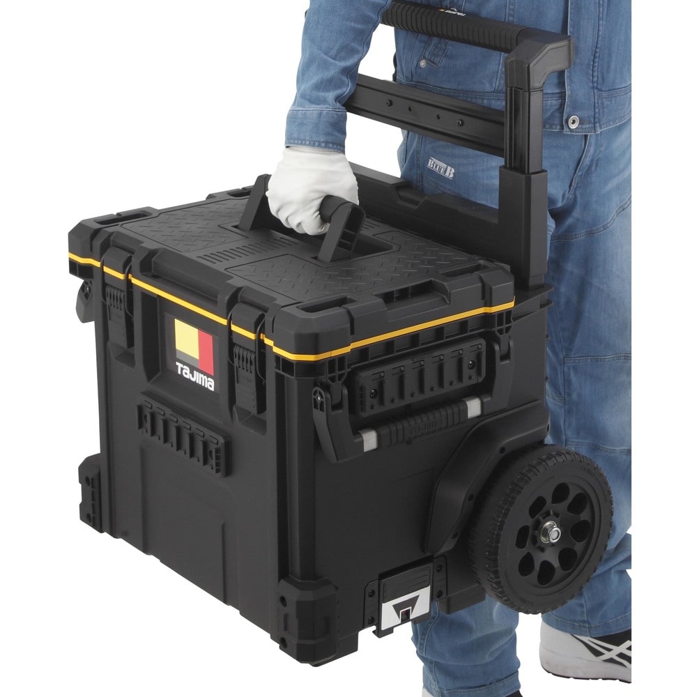 ●キャリー付きツールボックスです。●内側・外側にセフホルダー機能を搭載しています。(62個)●腰周りの「着脱セフ」商品をまるまる一式収納できる大容量仕様です。●重ねて置くだけでしっかり連結する荷崩れ防止設計です。●運搬の安定性を高めた高耐久ワイドキャリーハンドル、大型タイヤ仕様です。●片手持ち、両手持ちが可能な2wayハンドル仕様です。●IP65 準拠の防塵・防水仕様●色:黒●有効内寸(mm)間口:450●有効内寸(mm)奥行:265●有効内寸(mm)高さ:357●最大荷重(kg):50●使用時サイズ:H1032×W606×D440mm●保管時サイズ:H680×W606×D440mm●最大積載重量:50kg 質量11900g
