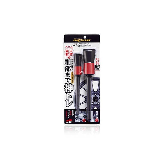 ホイールのナット穴やバルブ穴周辺などの細部の汚れまで残さずかき取るホイールクリーニング専用ブラシ。適度なコシのある天然豚毛100%素材が、従来の洗浄用スポンジでは届かない隙間の汚れもしっかりかき出します。大小2サイズのブラシをセットしておりますので、場所に応じて使い分けができます。