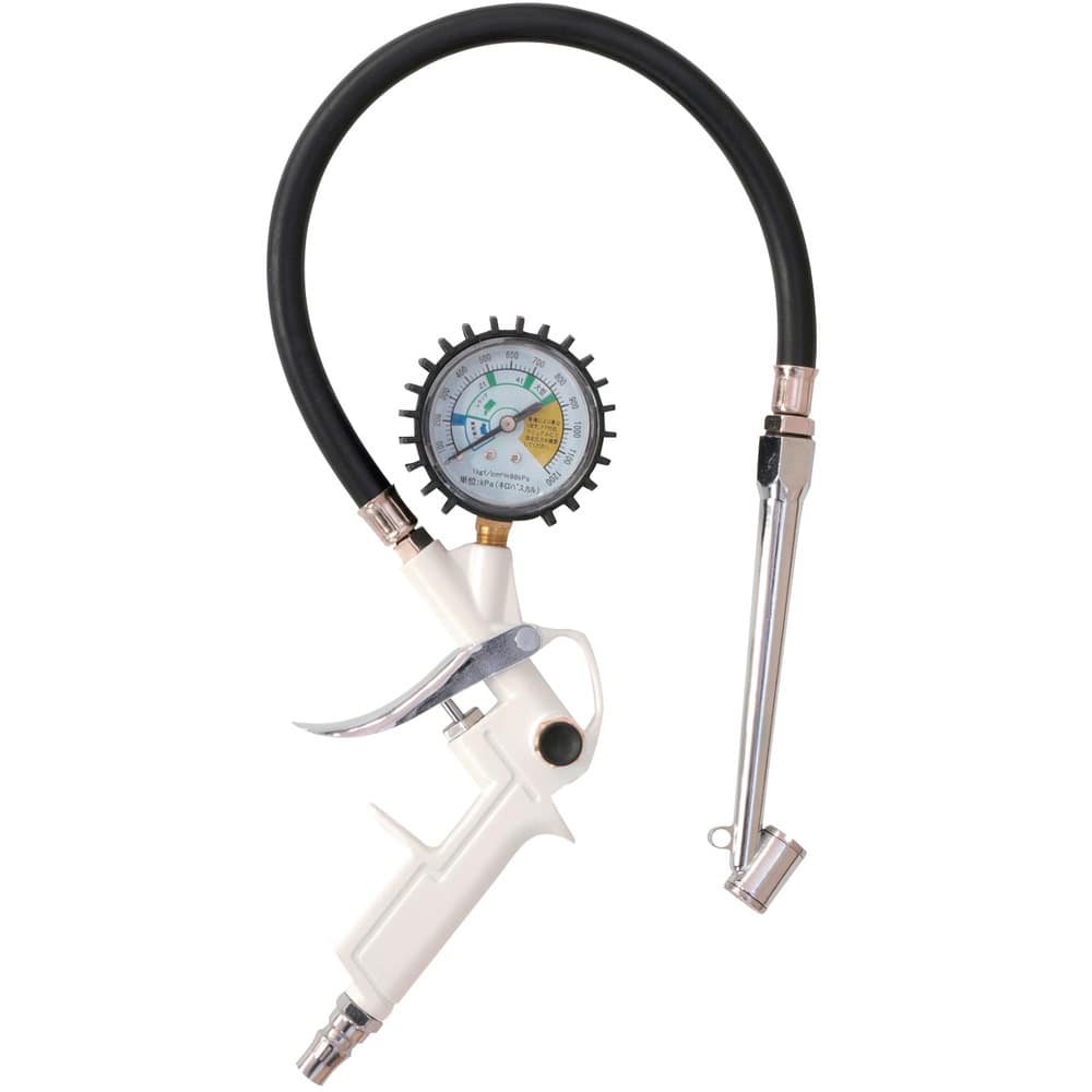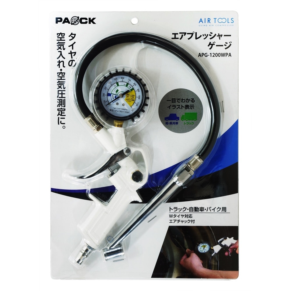 ●見やすい目安イラスト表示付です。●残留エア抜き用ボタン付きです。●ダブルタイヤに対応しています。●測定範囲(kPa):0-1200●最高使用圧力(MPa):1.2●適合流体:空気●最高使用圧力:1.2MPa●目量:20kPa●測定精度:±30kPa●チャック:米式バルブ●ホースサイズ(mm): 内径6.5x外径12x長さ330 質量360.000g
