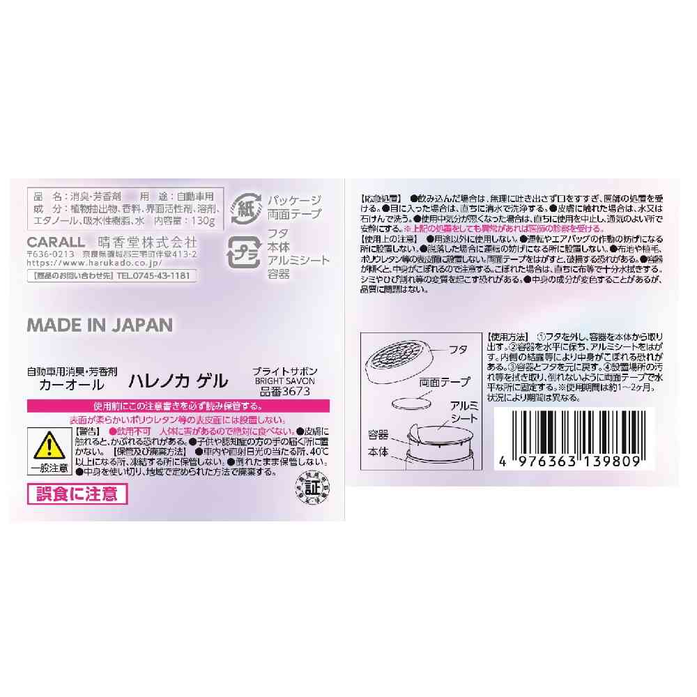 幸せ香る晴れのちドライブ 晴れ渡る空のように心躍る香りが心地よく広がります。 悪臭を感じにくくする香料“消臭アロマ”配合で車内を爽やかな空間に。 ときめきを感じる虹色デザインのゲルタイプ。 使用期間 :約1~2ヶ月 ※使用状況により異なります。 ブライトサボン:心躍るきらめく空と虹色の香り